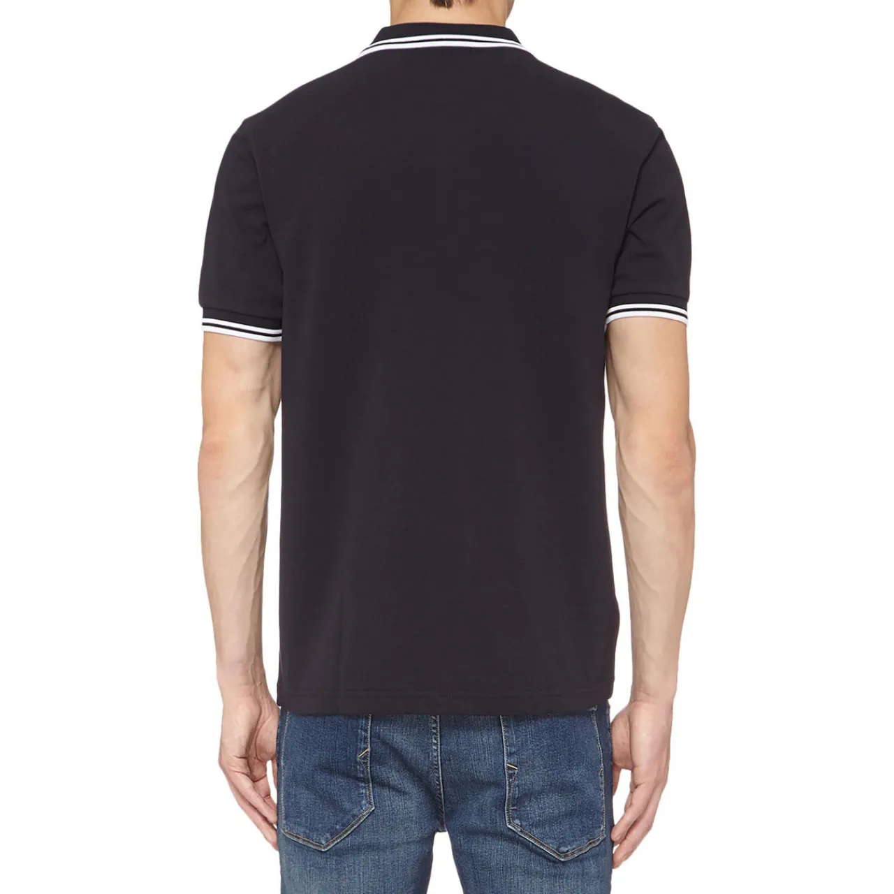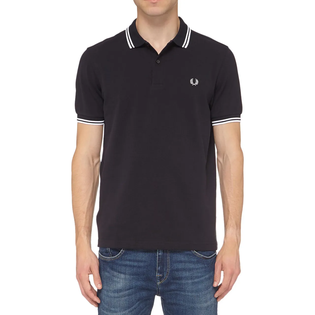 - Short sleeves, pointed collar, two-button fastening, piqué weave, contrasting trims, embroidered logo