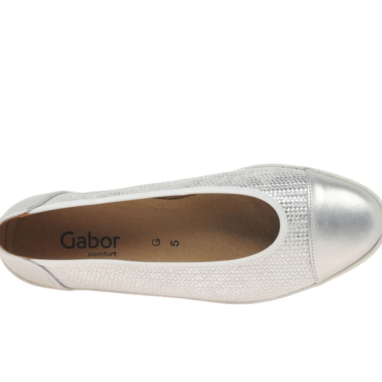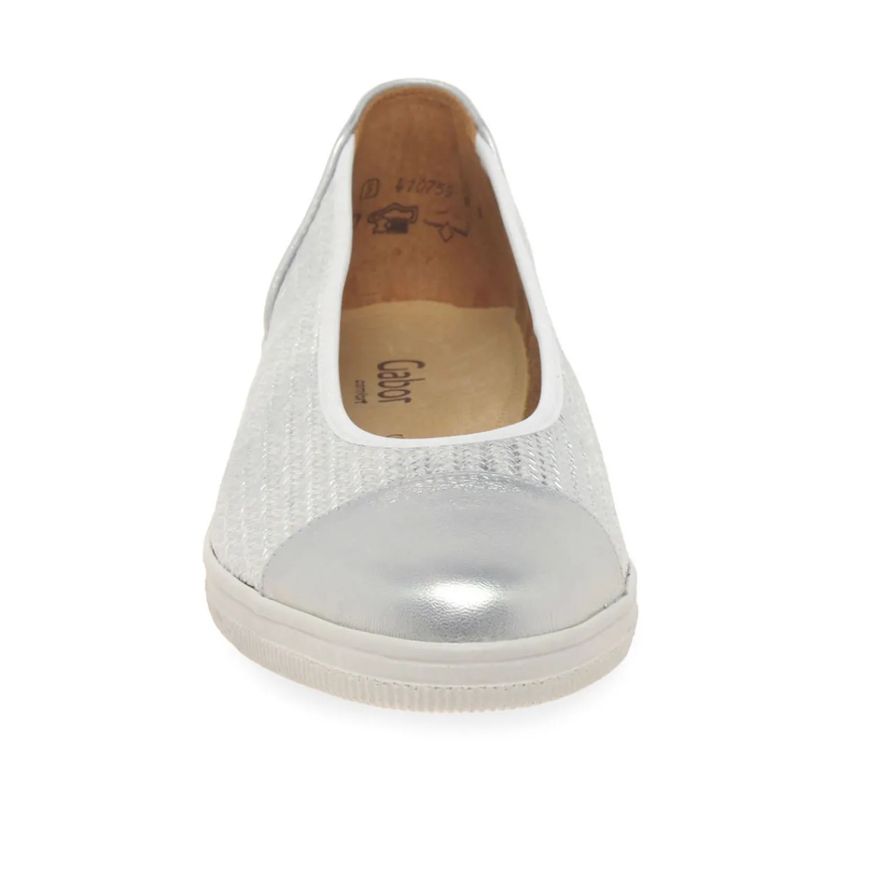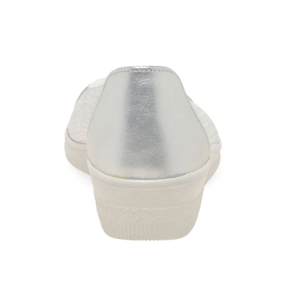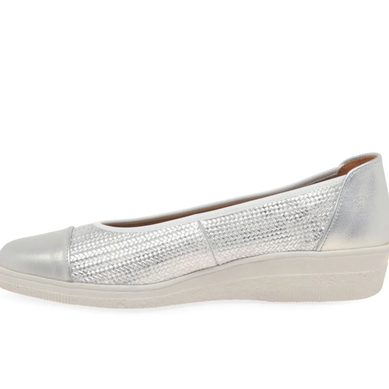 - Low wedge heel, textured upper, metallic finish, smooth toe and heel cap, slip-on style, round toe