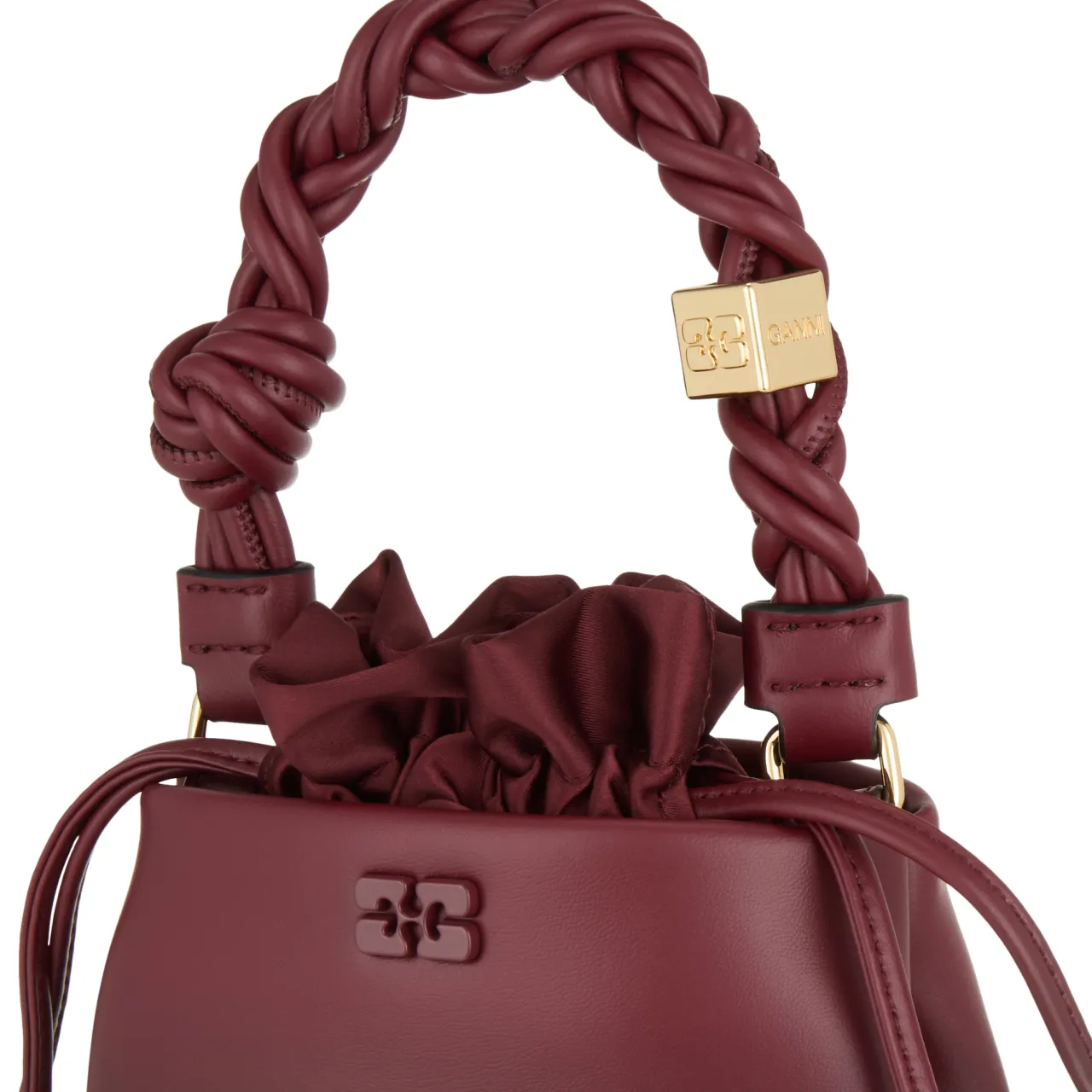 - Braided top handle, drawstring fastening, branded dice charm, gold-tone hardware, magnetic closure, butterfly logo, smooth gradient finish, bucket silhouette