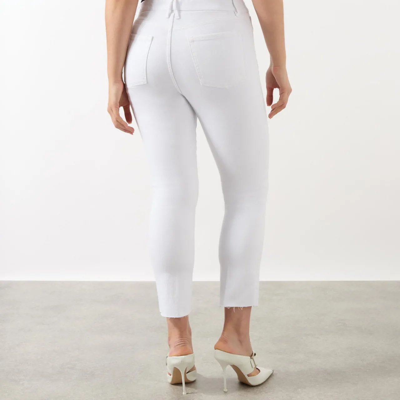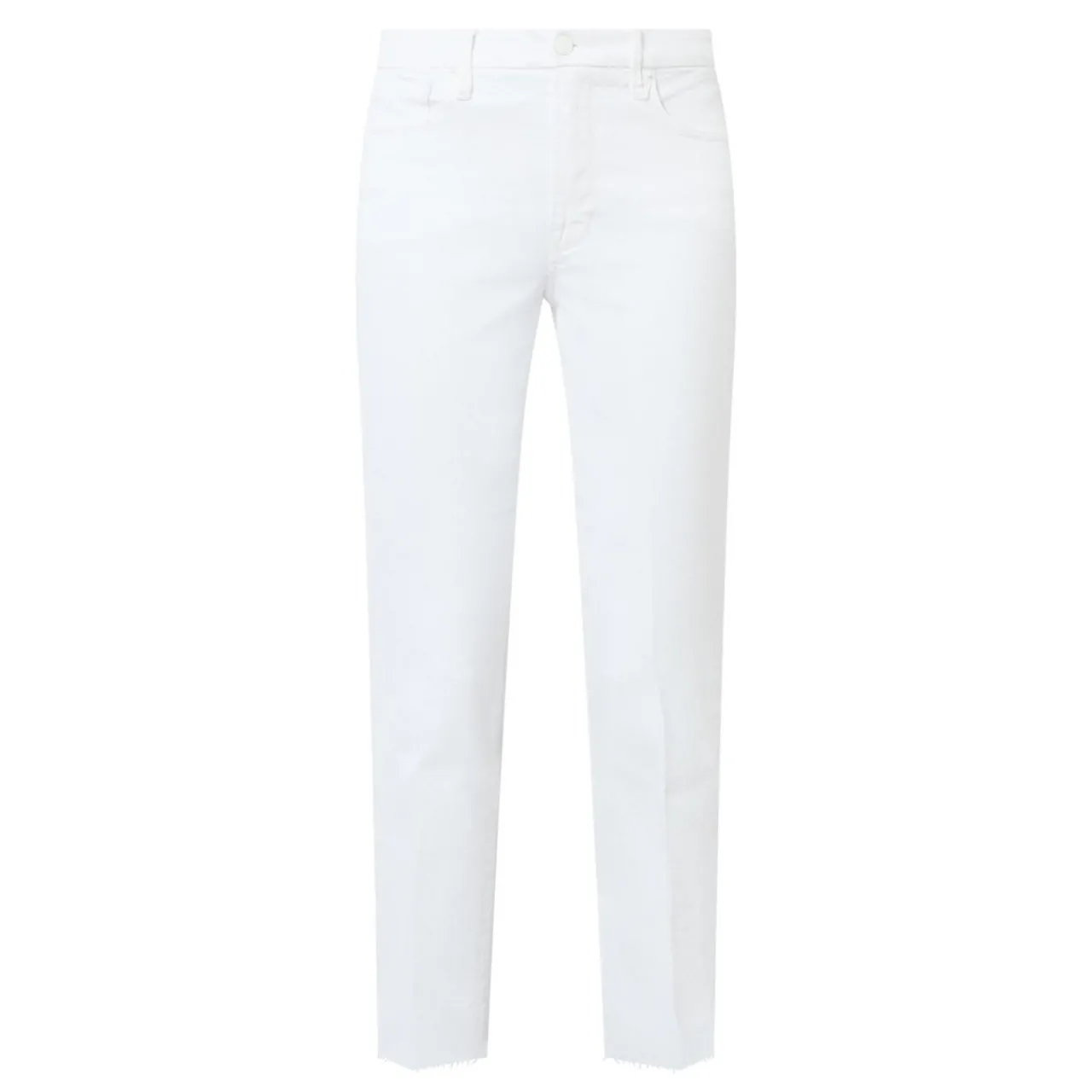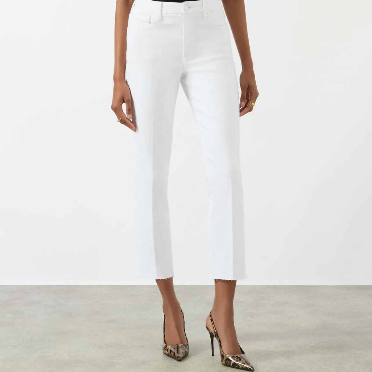 - High rise, gap proof waistband, reinforced belt loops, straight leg, raw hem