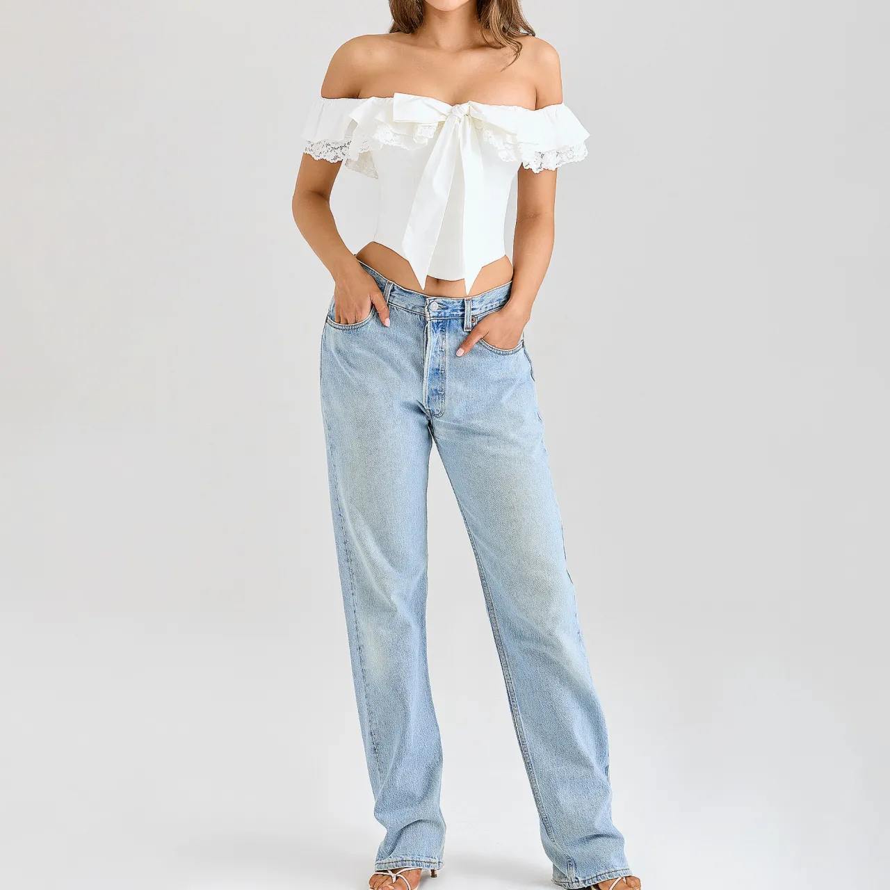 - Off-the-shoulder design, frill detailing, layered lace ruffles, statement bow, refined structuring at waist, bust support, back zip