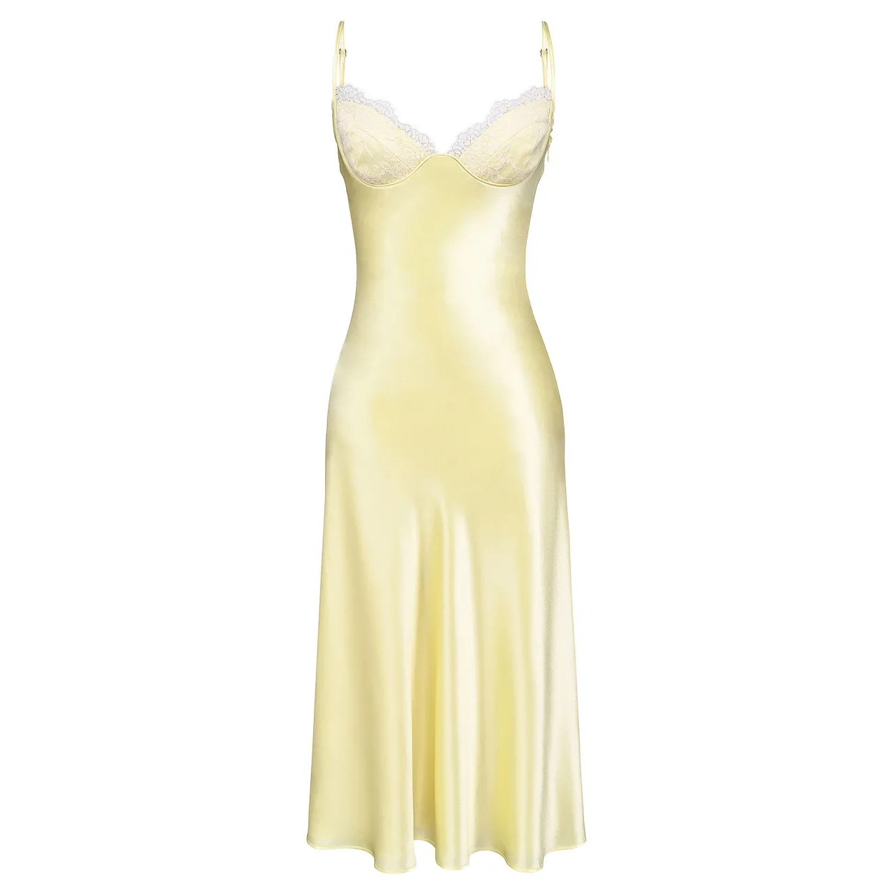 - Bias cut midi silhouette, adjustable straps, underwired bust, lace bust detail, side zip