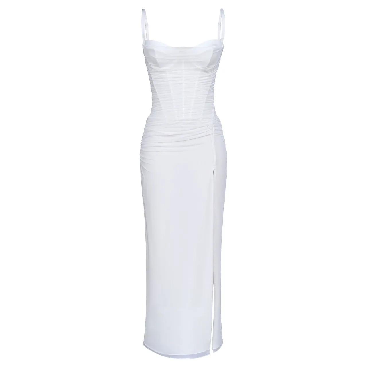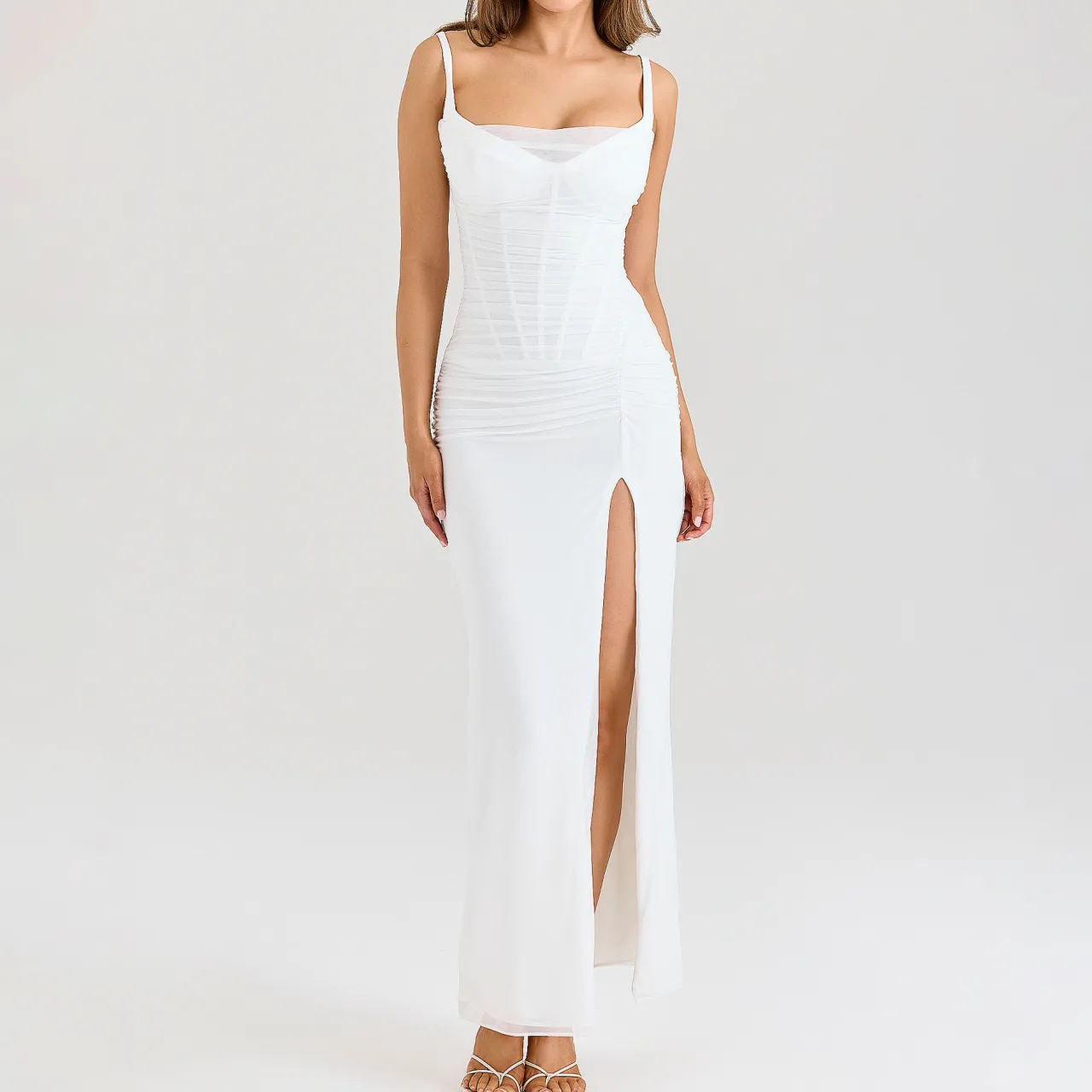 - Soft mesh overlay, adjustable straps, back zip, power mesh lining, sculpting technology, delicate ruching, gathered maxi silhouette
