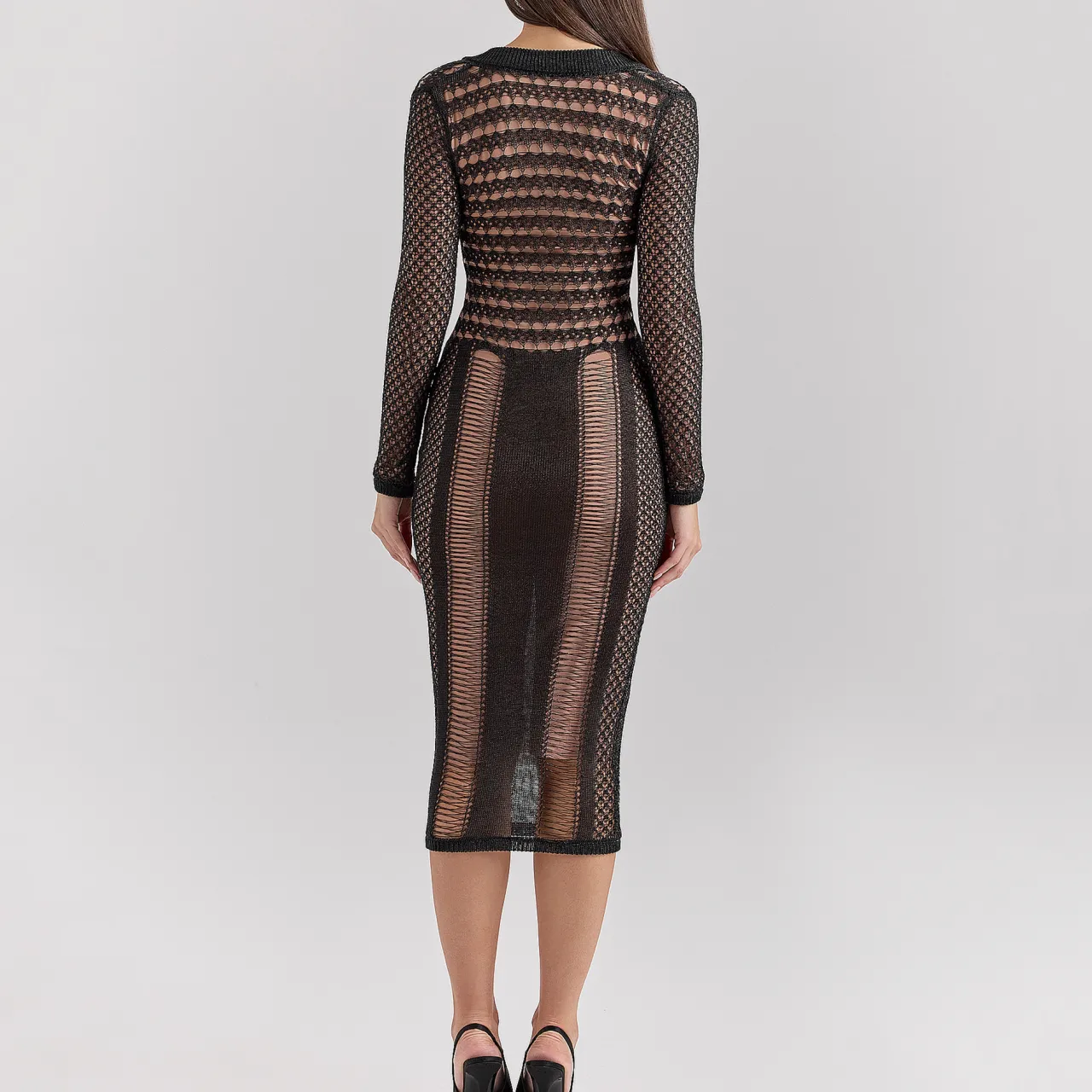 - Metallic finish, open-knit construction, bodycon fit, plunging neckline, long sleeves, midi length
