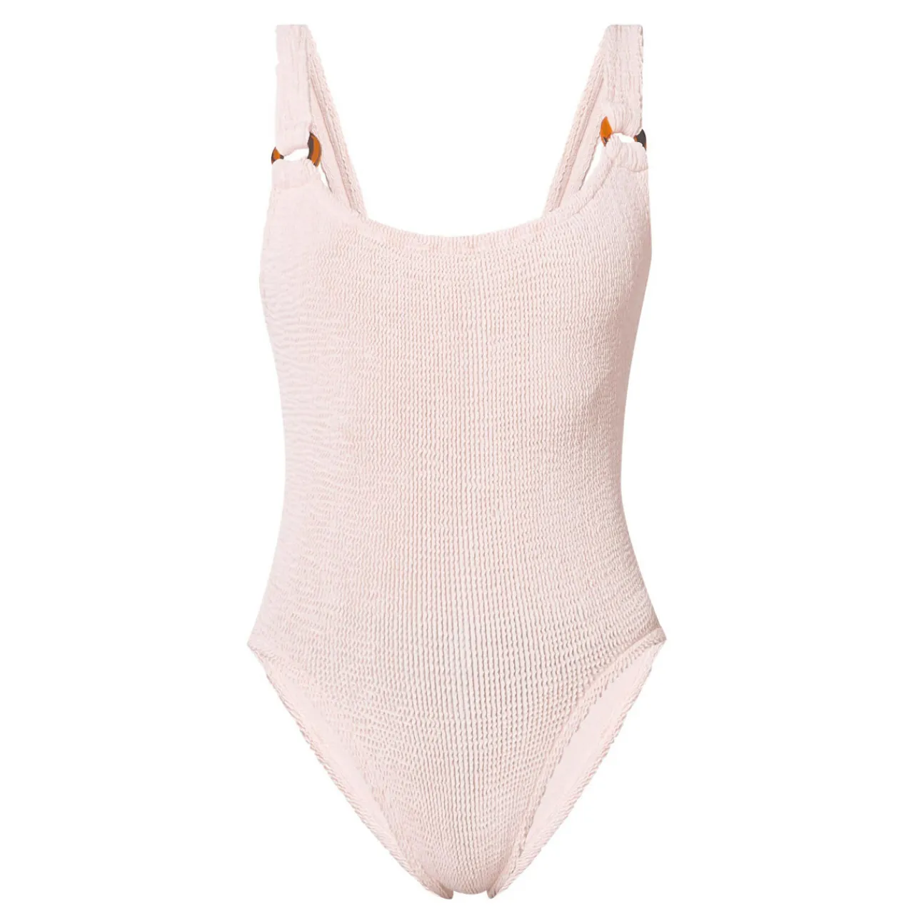 - Scoop back, tortoiseshell hoop straps, stretch fit, crinkle fabric.