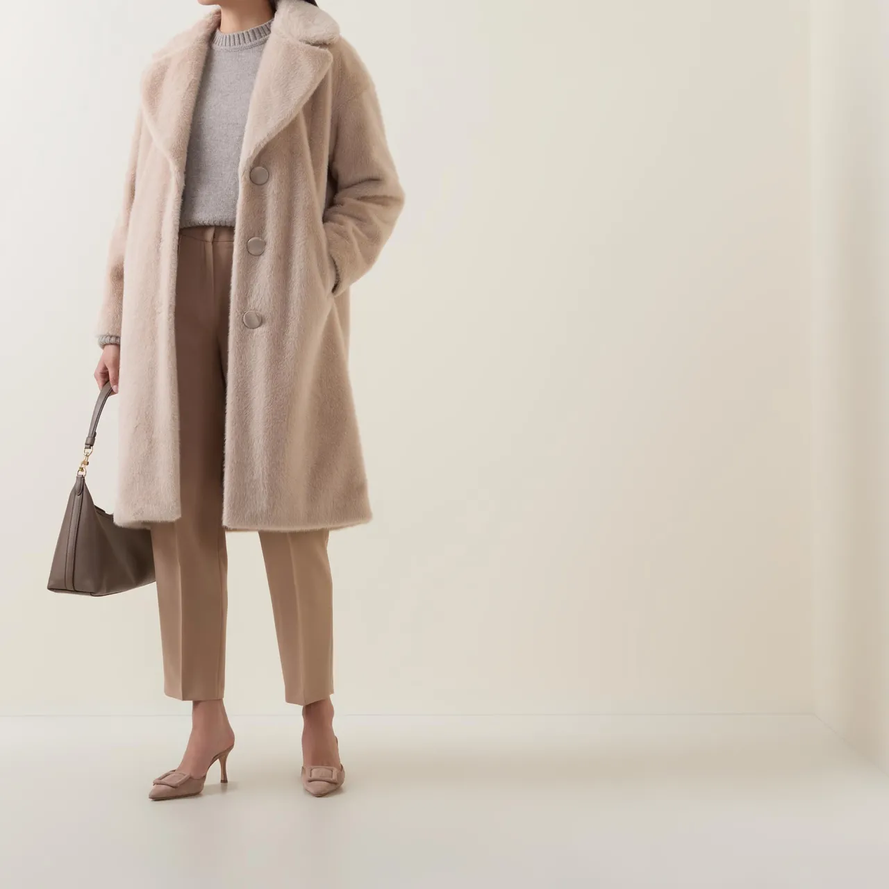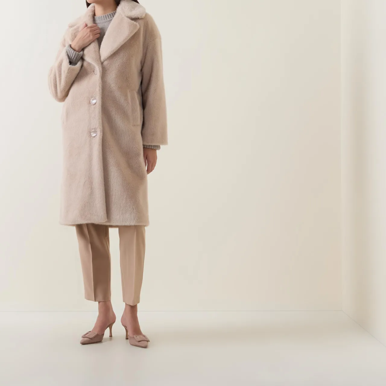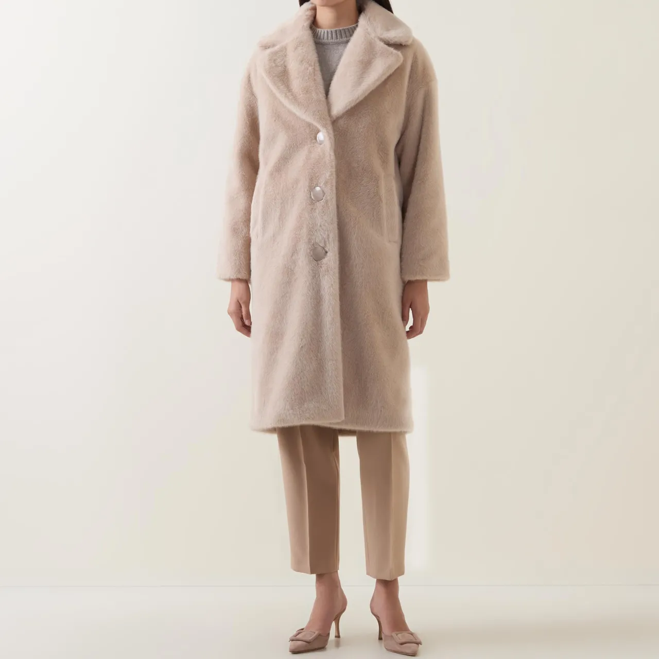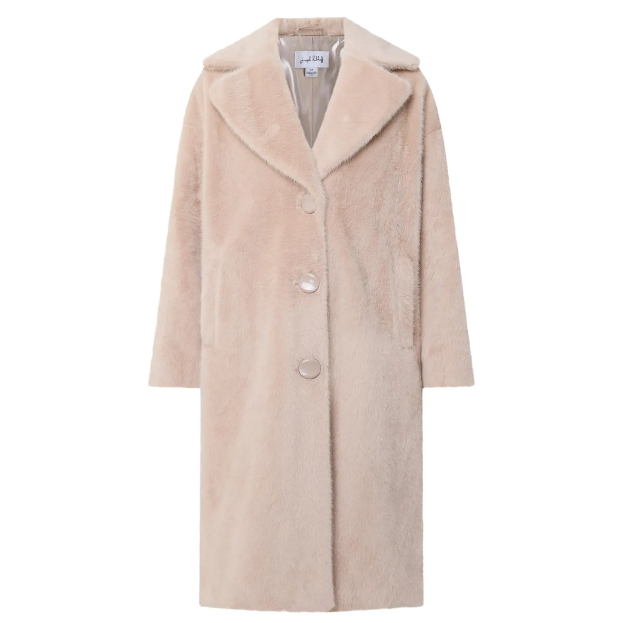 - Single breasted, exaggerated notch lapel, long sleeves, front button fastening, two vertical welt pockets, straight hem, faux fur finish