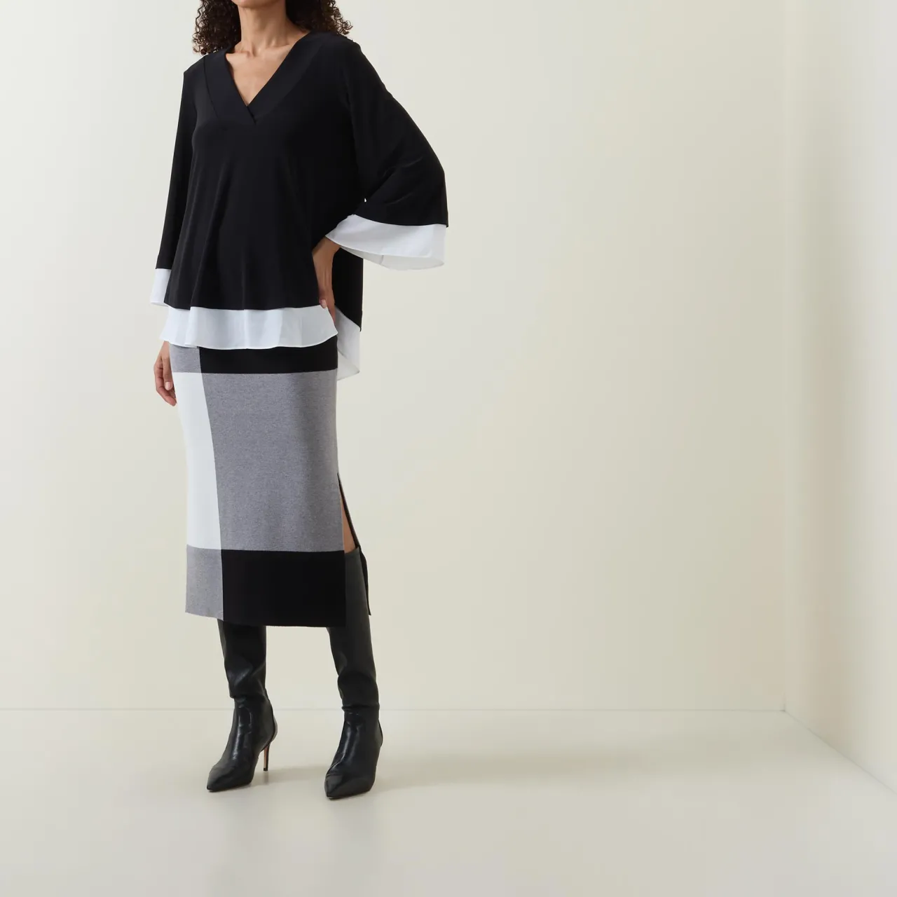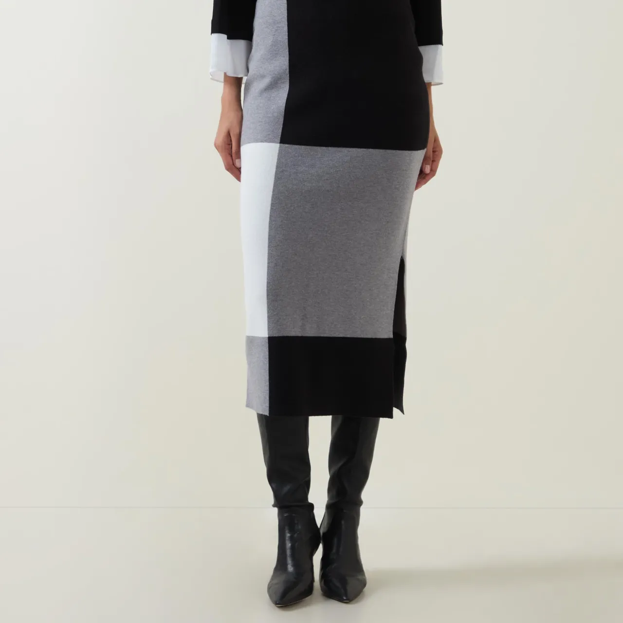 - High-rise, panelled colour-block design, pencil silhouette, open-cut side slit, midi length, smooth fabric