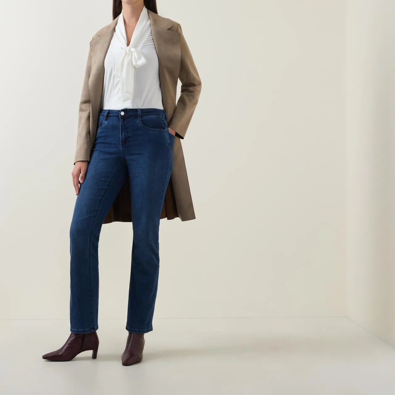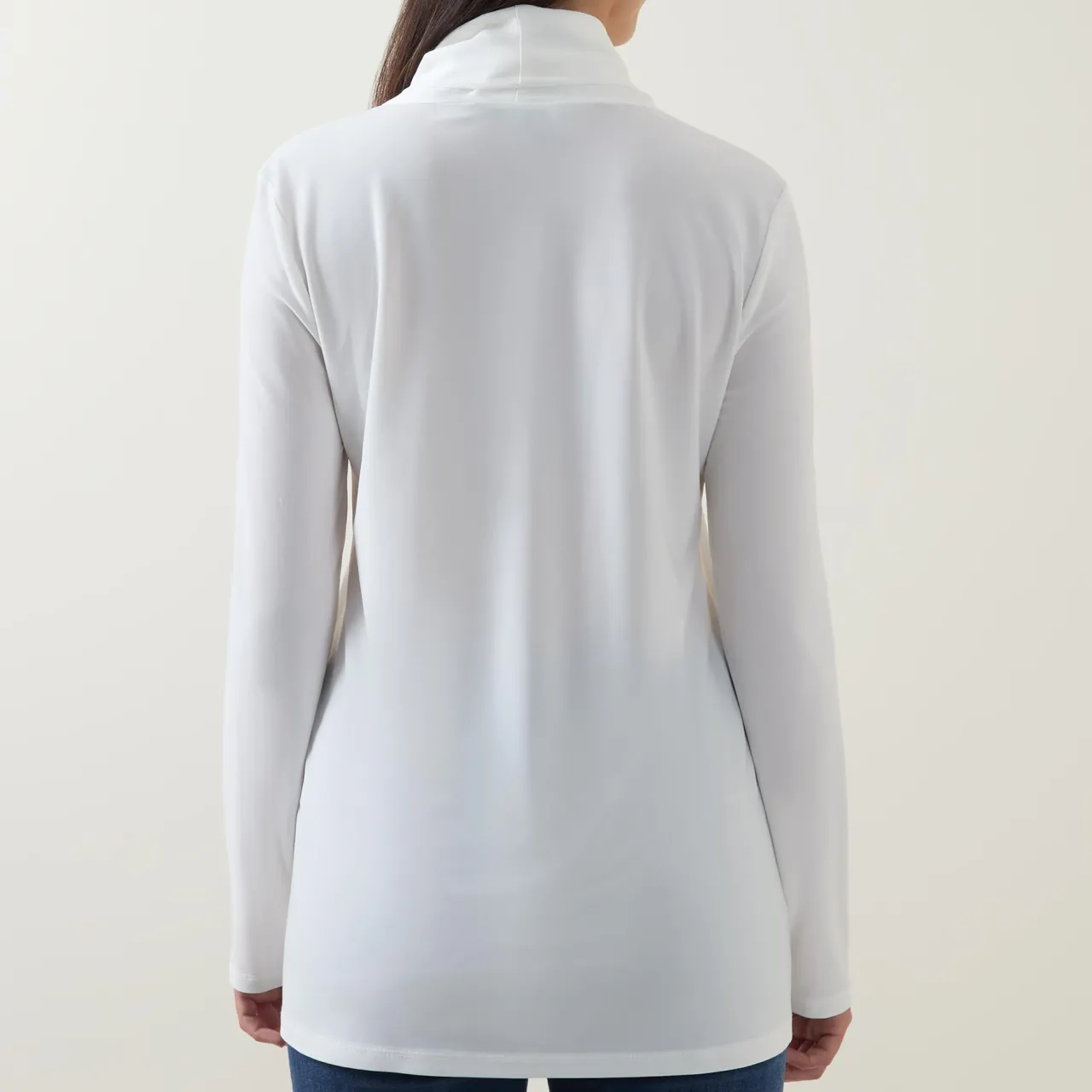 - Stand collar, tie-neck fastening, long sleeves, straight hem, satin trim detailing, longline design, smooth finish