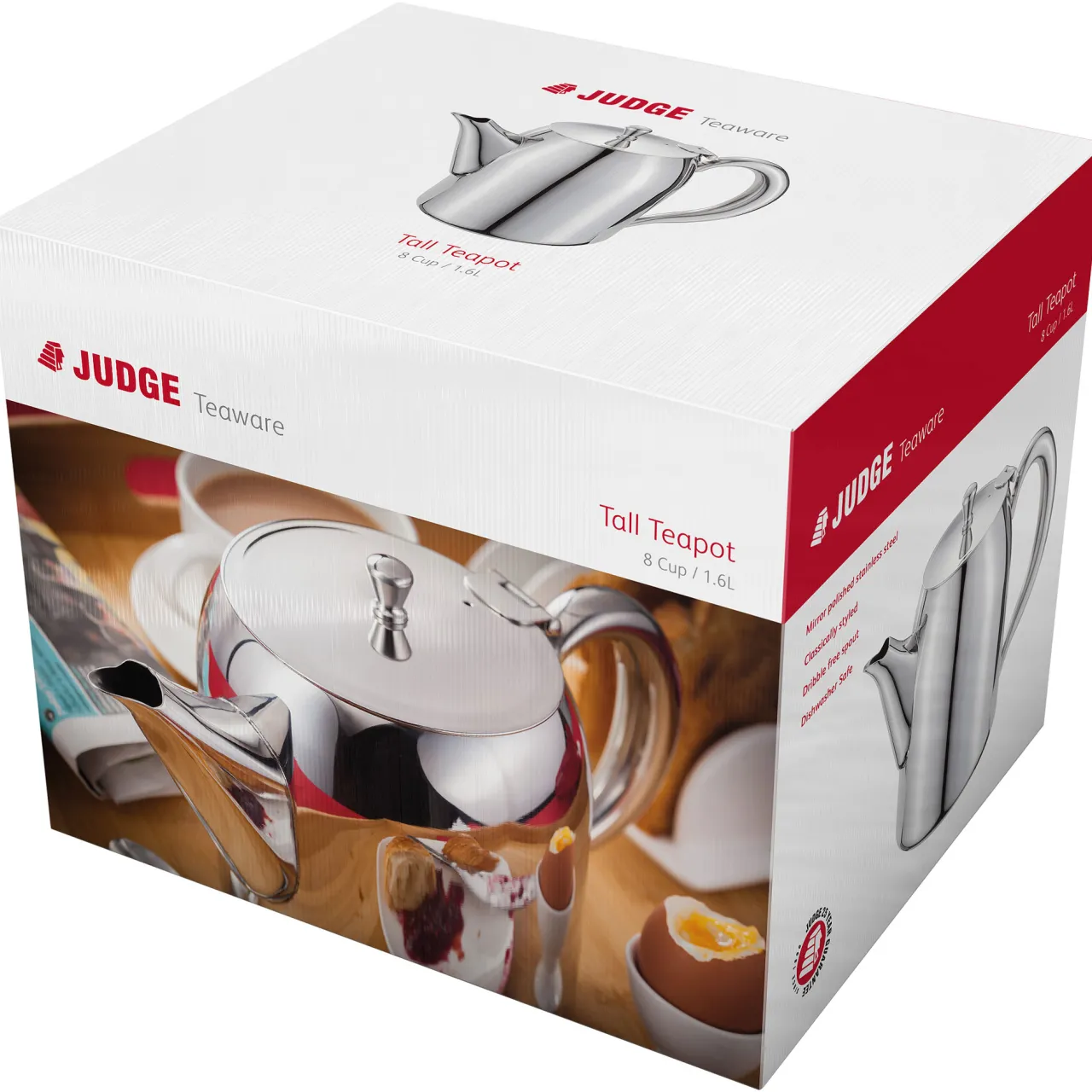 - Highly polished stainless steel, comfortable handles, dribble-free pouring, eight cup capacity, 1.6L