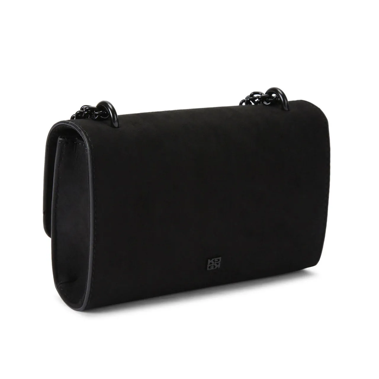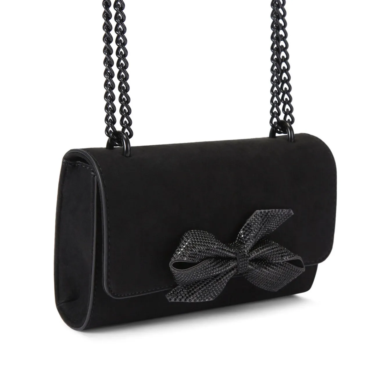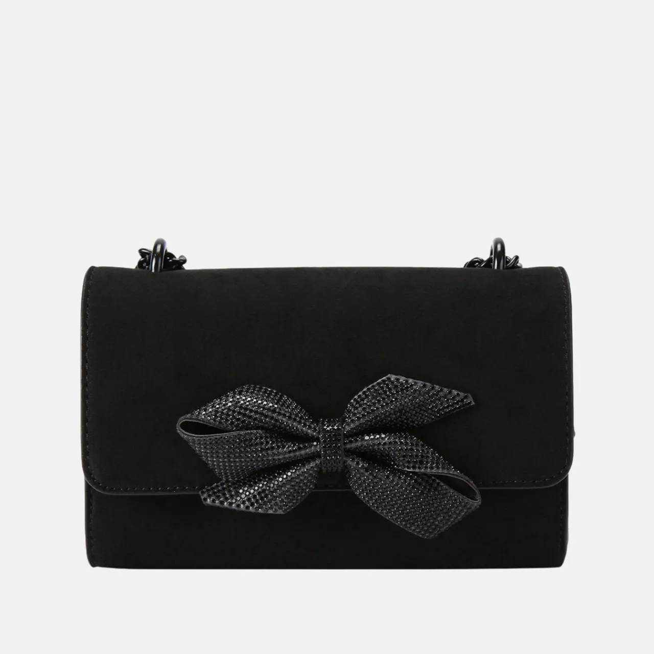 - Suedette outer, flap-front with magnetic closure, silver-tone crystal encrusted bow, chain crossbody strap
