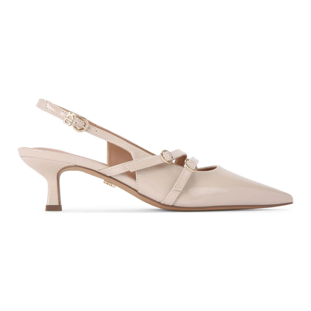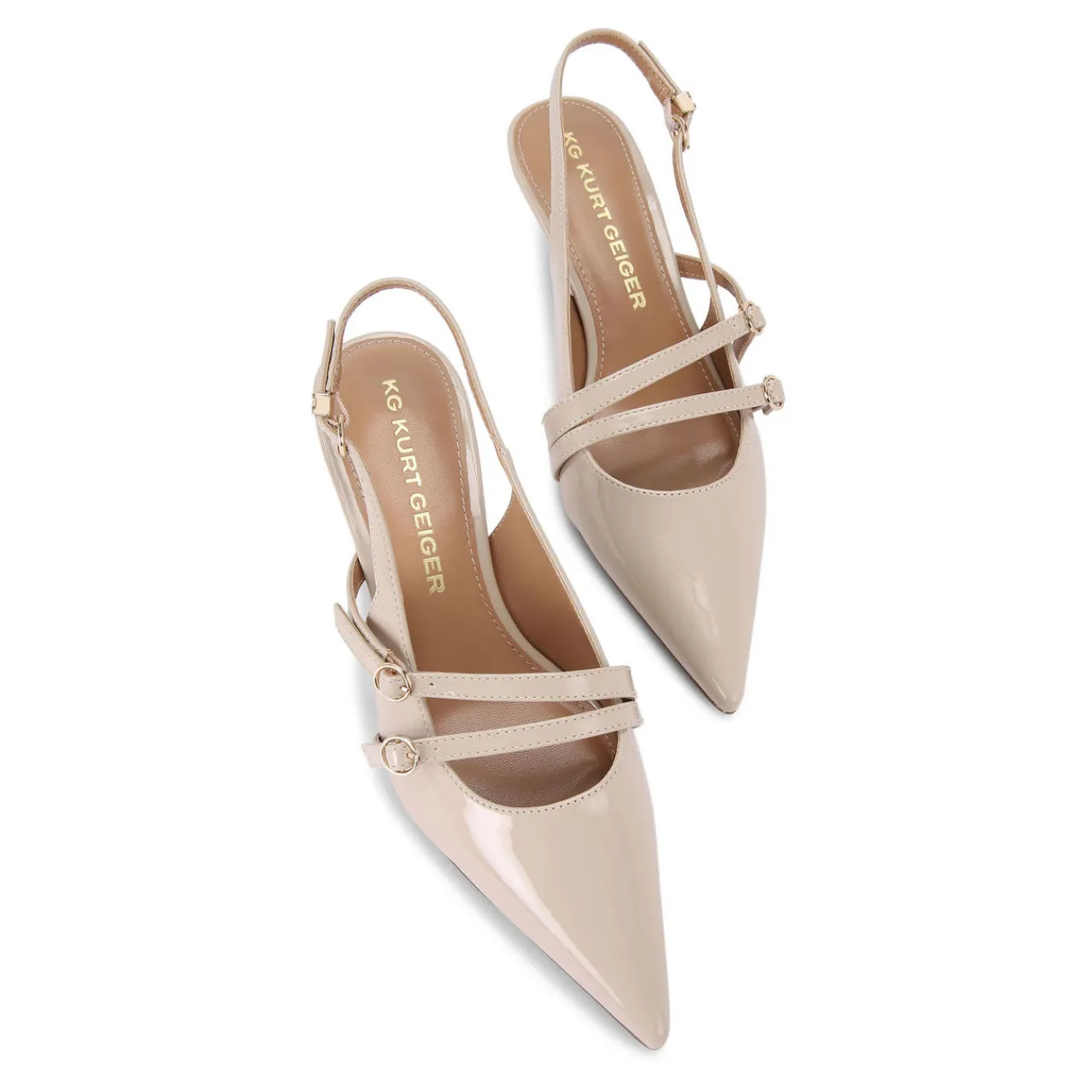 - Patent upper, pointed toe, two foot straps with buckle fastenings, slingback strap with buckle fastening, gold-tone branded hardware, flared heel