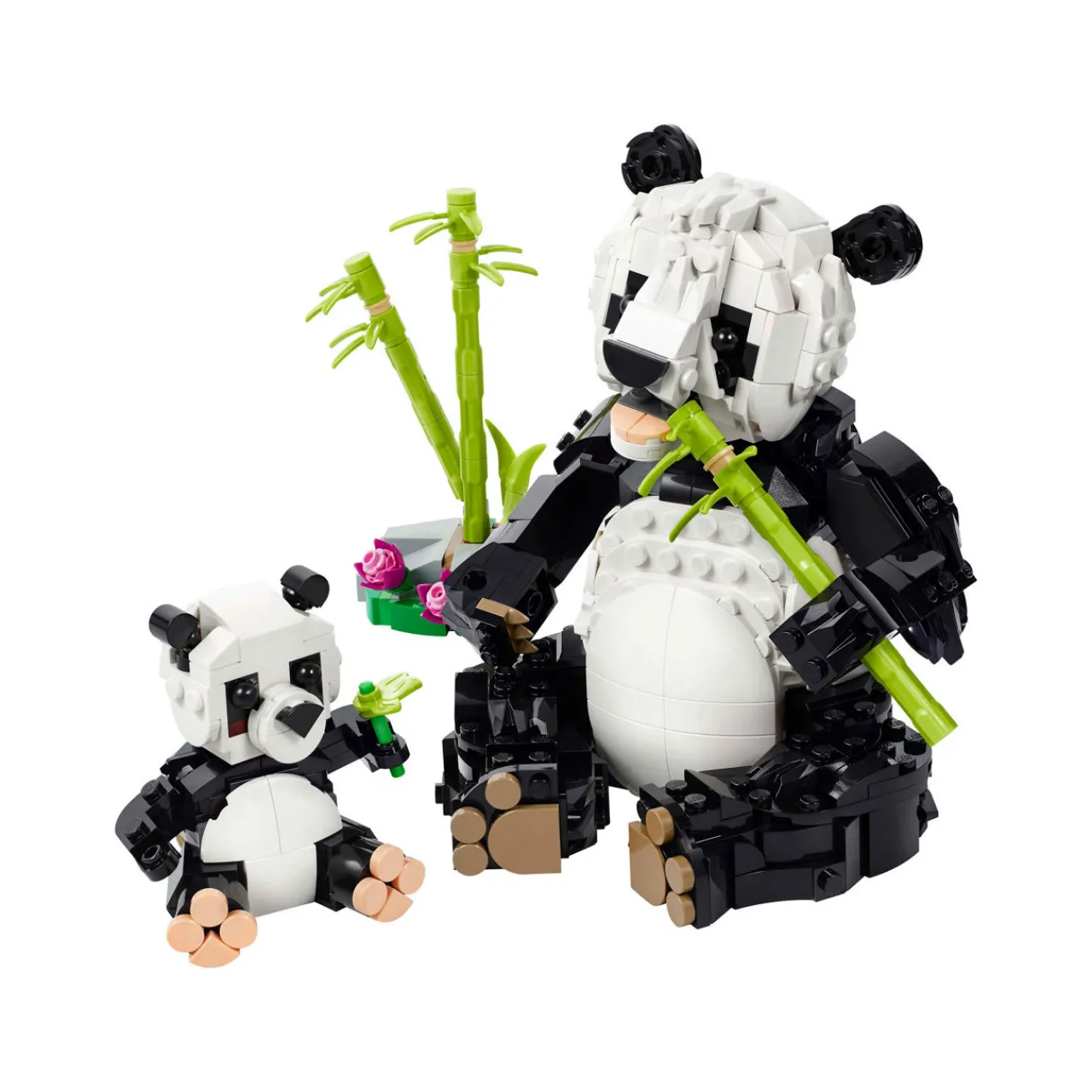 - 626 pieces, choose to build either a posable panda figure with its cub next to bamboo stalks; a posable orca figure with its calf, who can be displayed together on transparent stands; or a posable penguin toy and its chick on a patch of ice and water