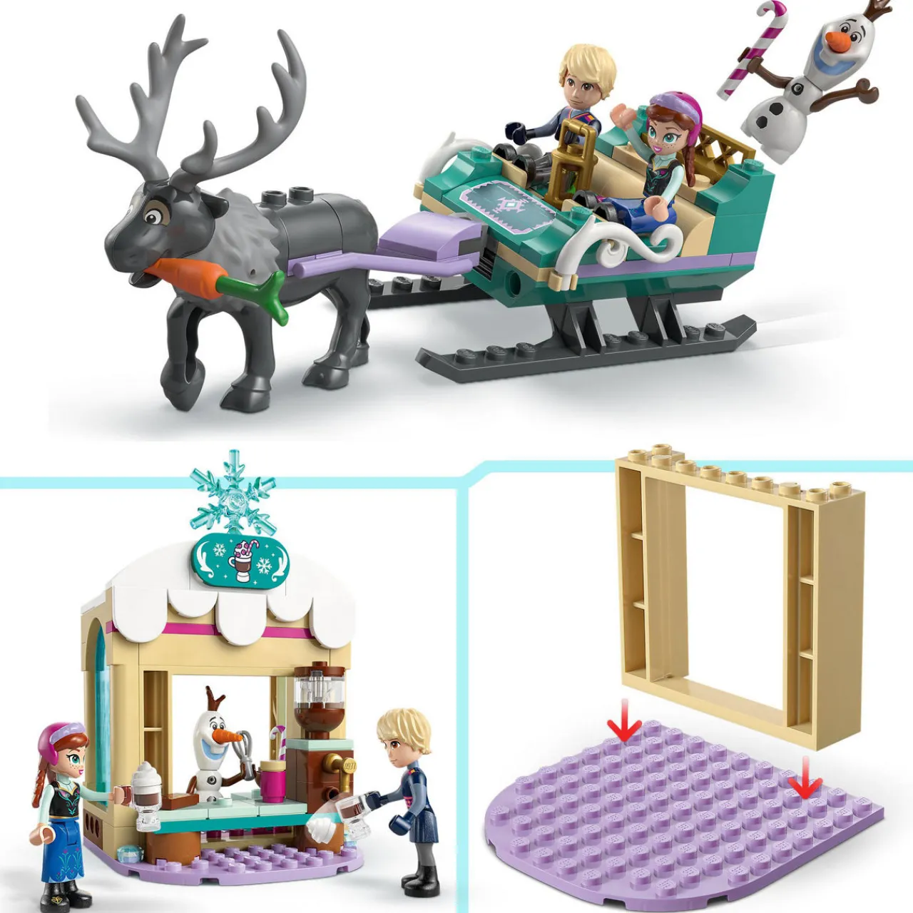 - 192 pieces, starter blocks for stable and hot chocolate stand, four Frozen minifigures, one sleigh, role-play accessories
