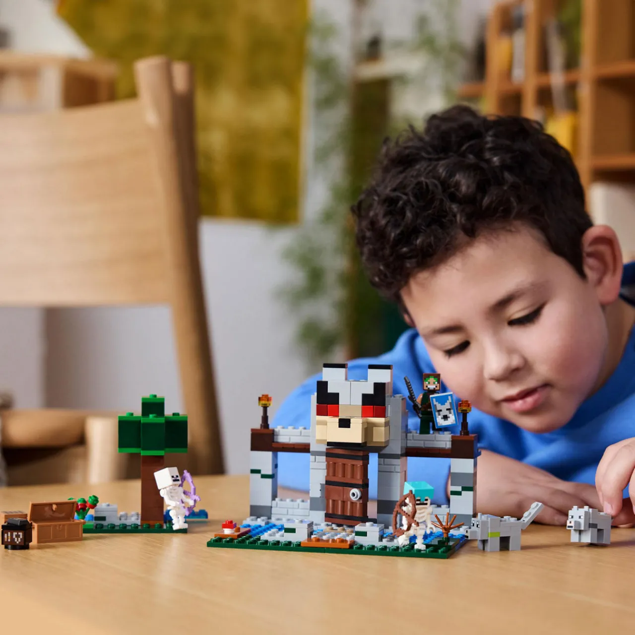 - 312 pieces, explorer-hero playset, buildable toy fortress, craft weapons, crafting table, blast furnace, anvil, smithing table, Minecraft® Wolf Tamer figure, 2 skeletons, 2 wolves