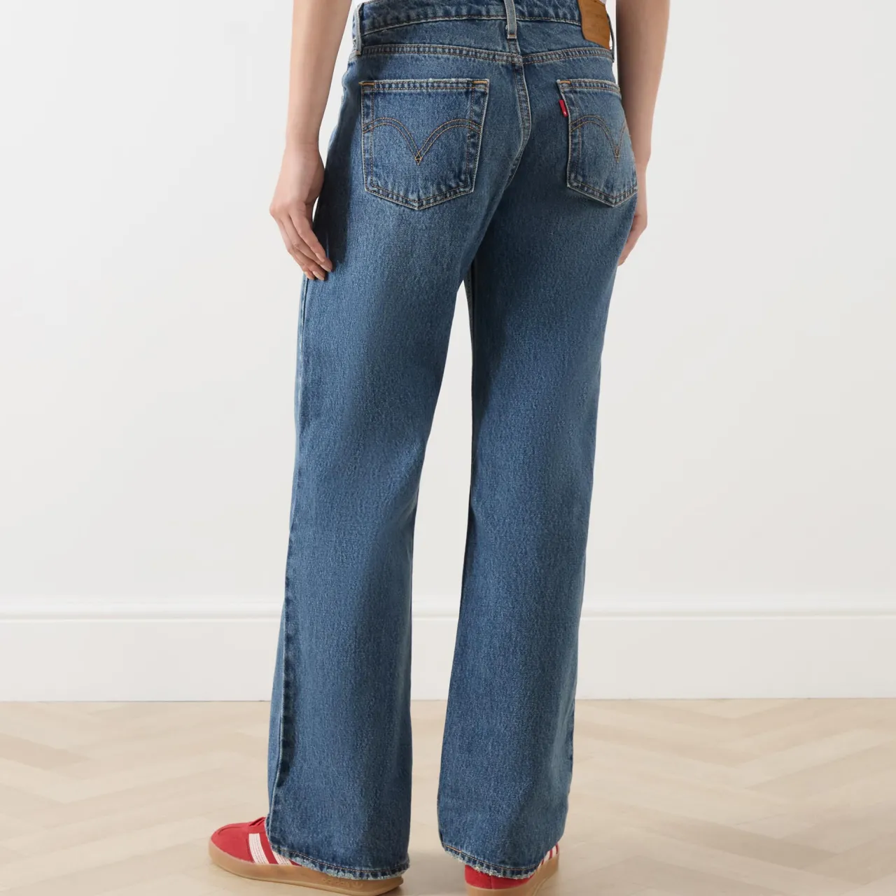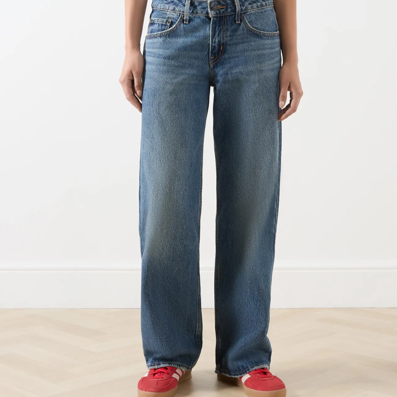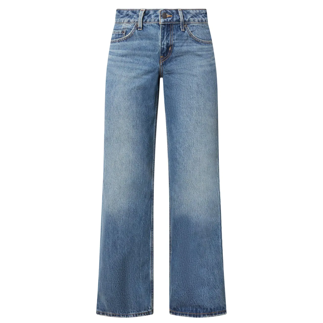 - Zip-fly and button fastening, belt loops, five-pocket design, contrast top stitching, rear logo patch, whiskering and faded detailing, low-rise, wide-cut leg, smooth denim finish