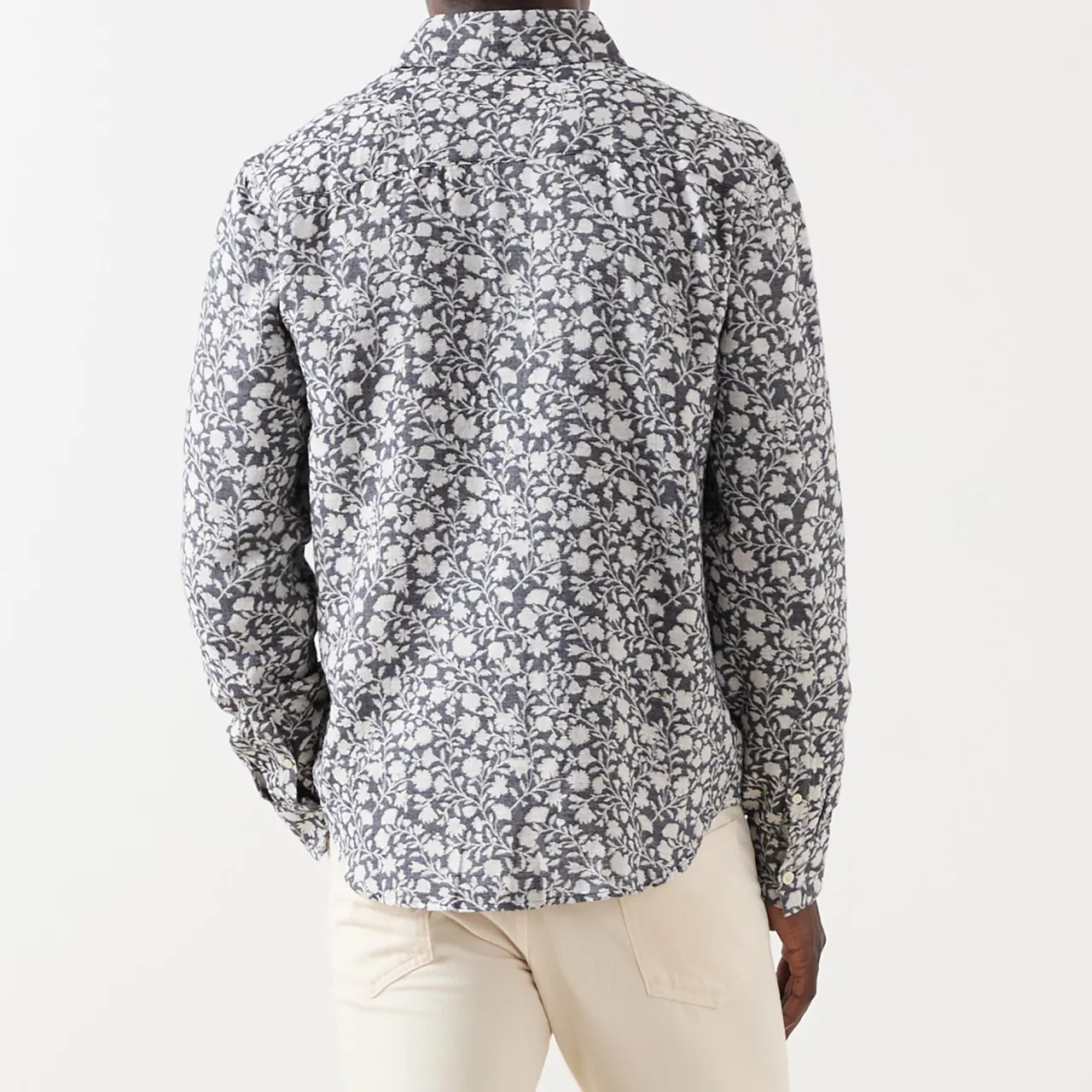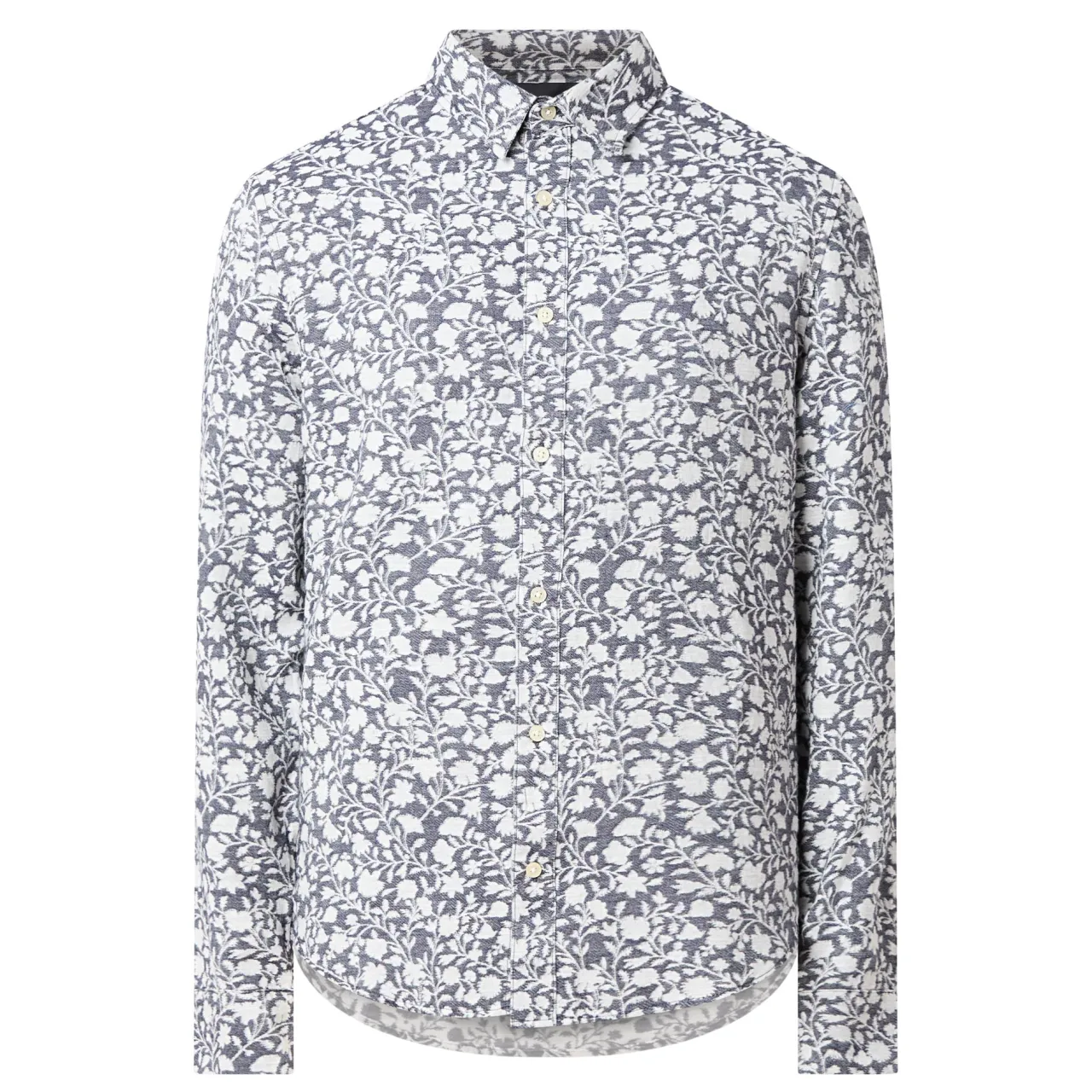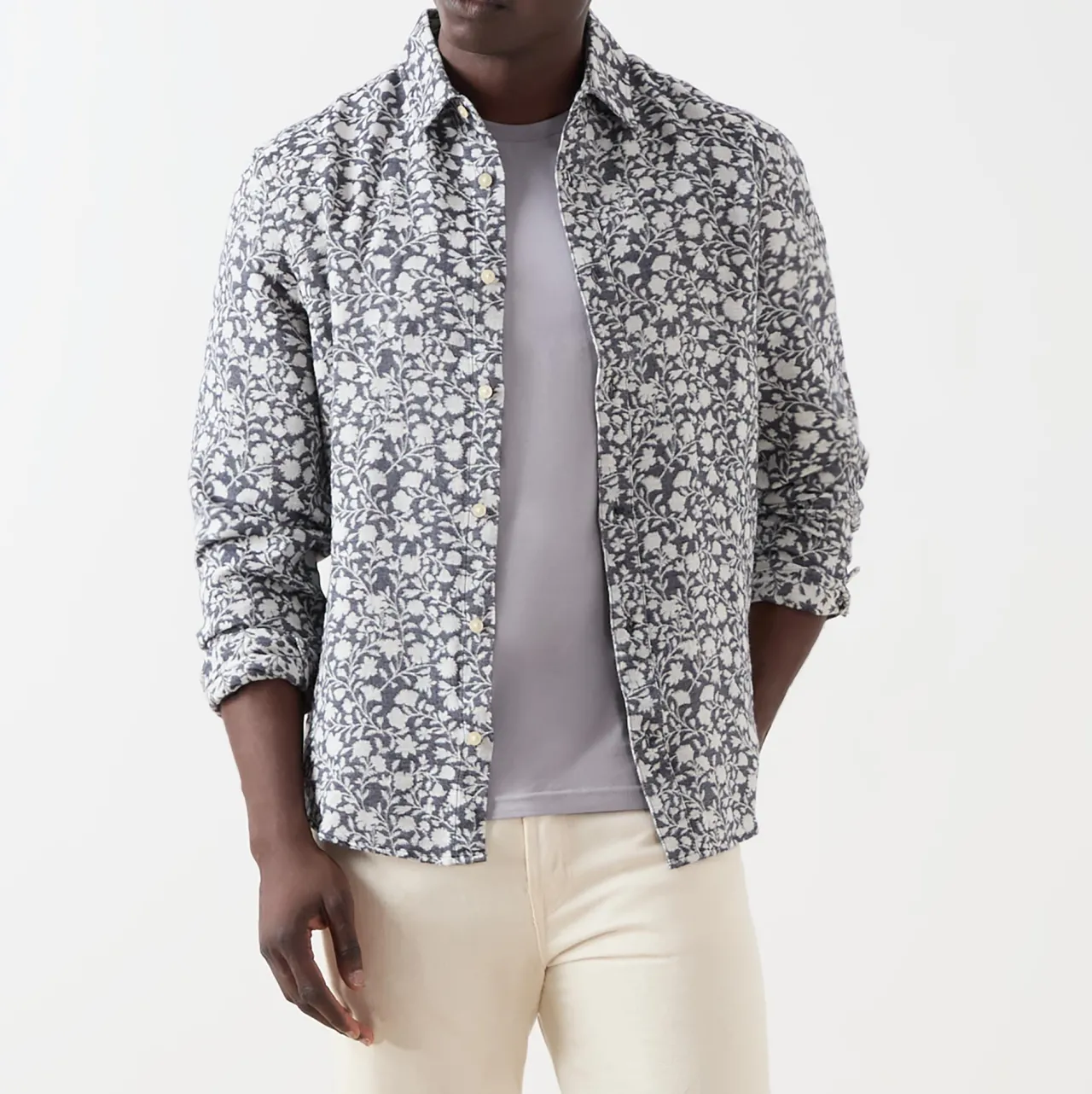 - Long sleeves, point collar, front button placket, floral jacquard, single-button cuffs, tonal stitching, curved hemline, smooth fabric