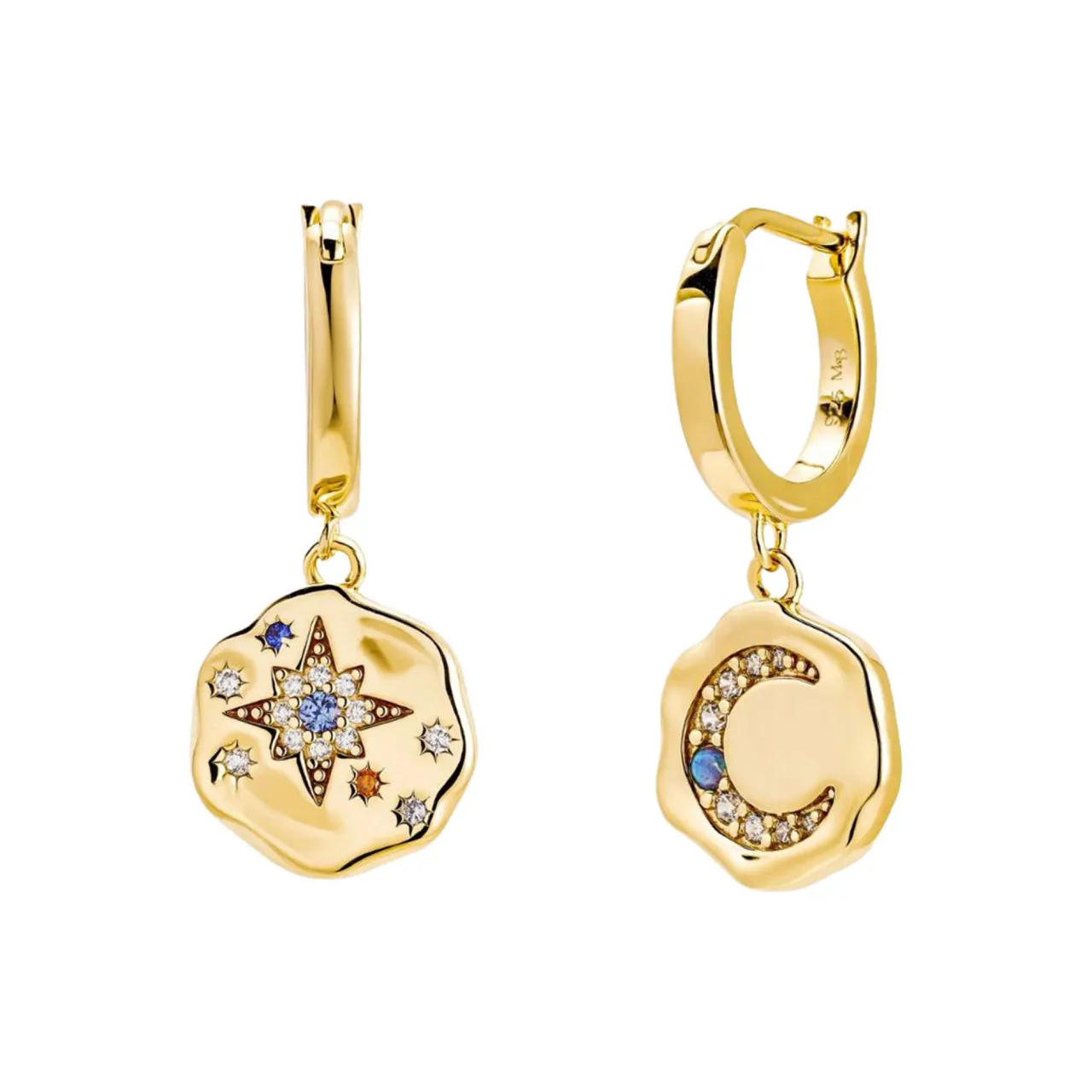 - Electrocoating applies a protective layer to jewellery via an electrically charged solution, ensuring durability, corrosion resistance, and consistent colouring, gold-toned hardware, sun, moon and star motifs, drop style