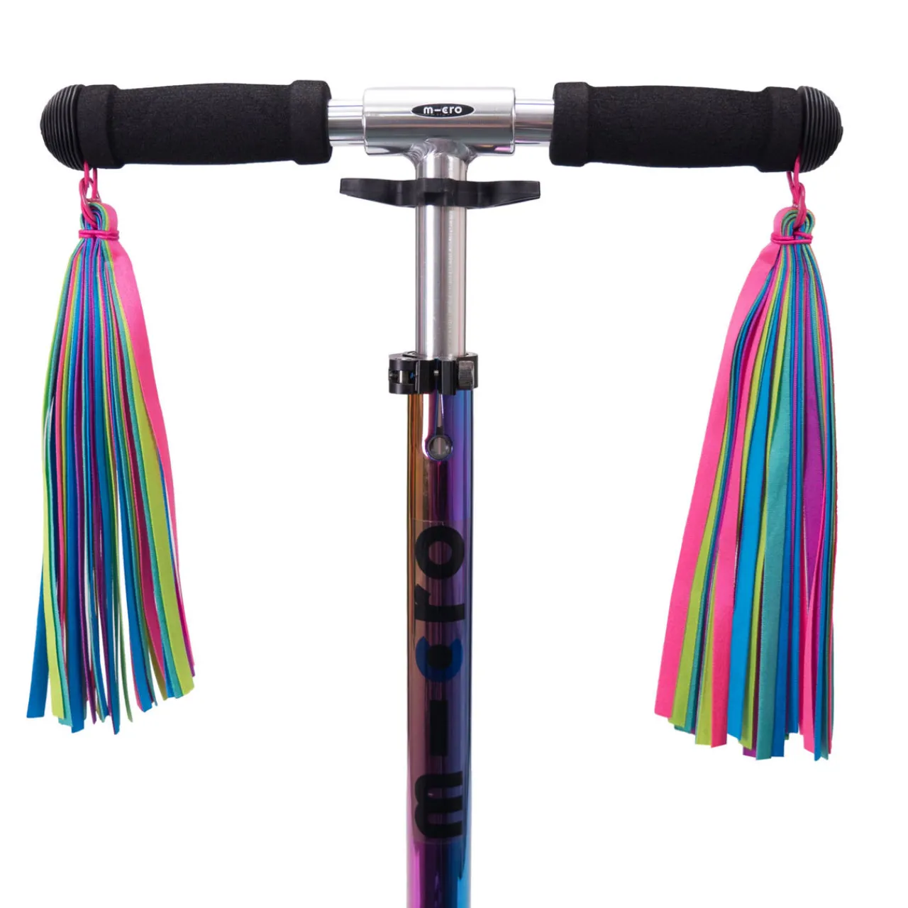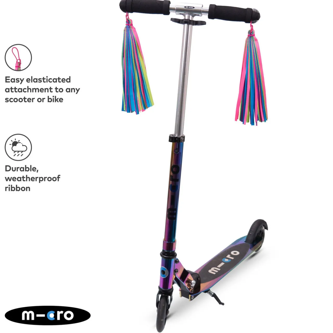 - Set of two, tassel style, elasticated attachment loop, durable and weatherproof ribbon, multi-coloured design
