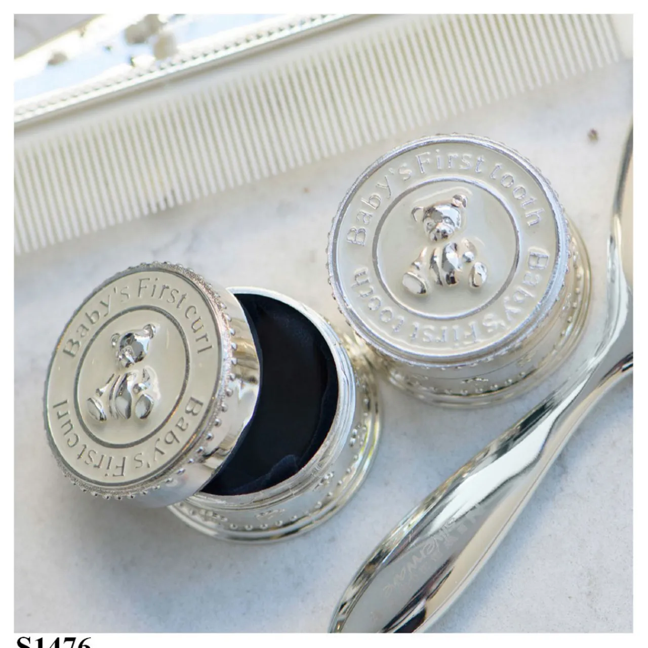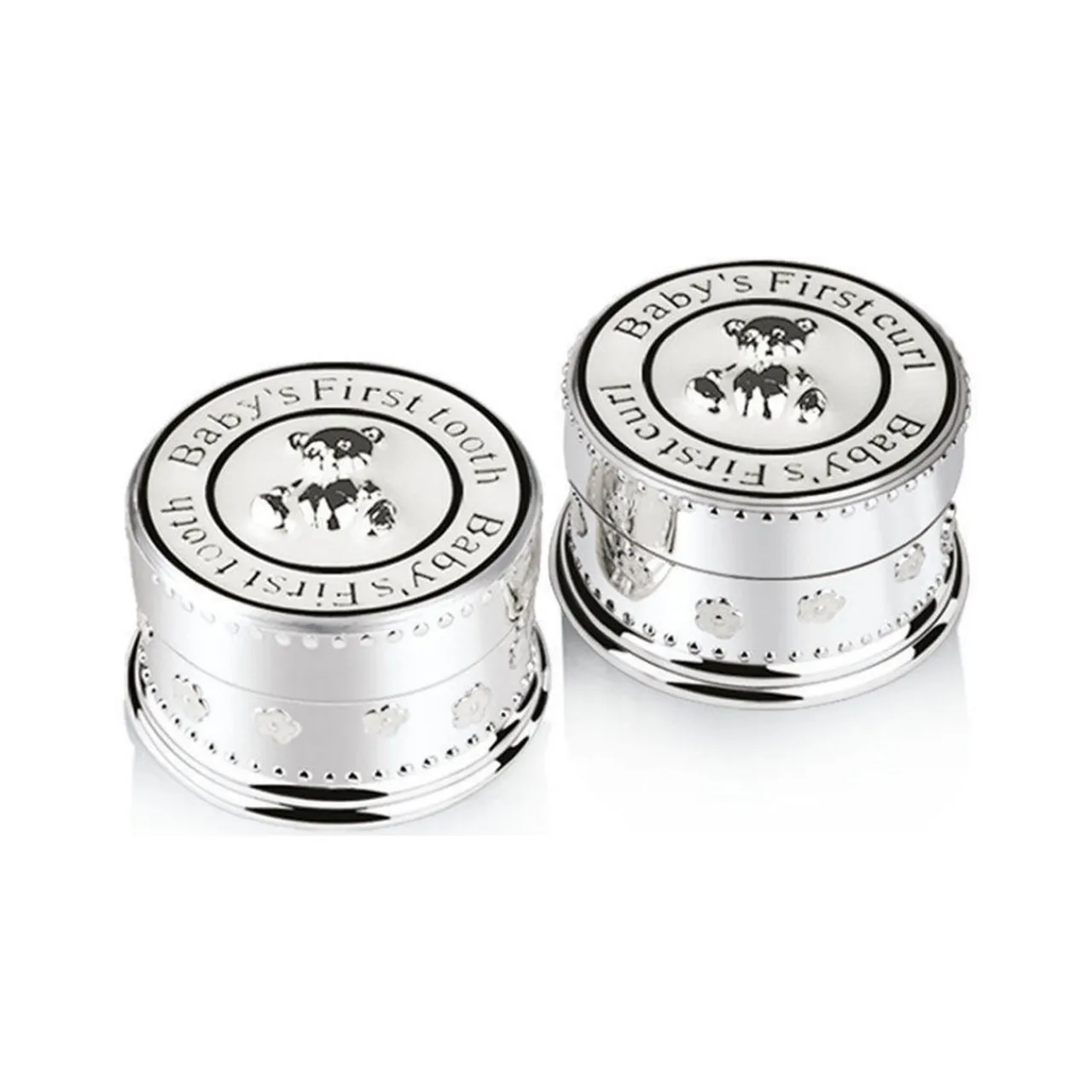 - Two-piece set, perfect new baby gift, teddy bear details, first tooth and curl set, polished silver plated finish, presented in signature Newbridge Silverware Gift Box
