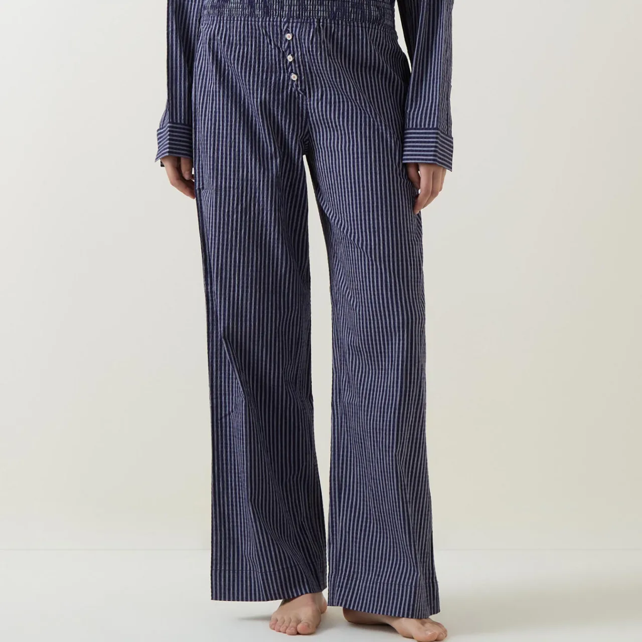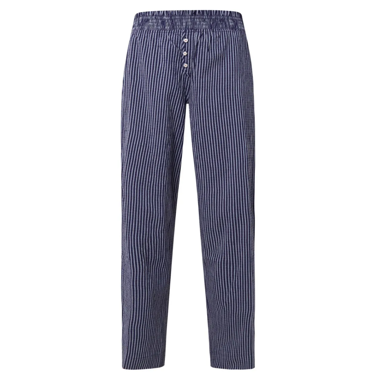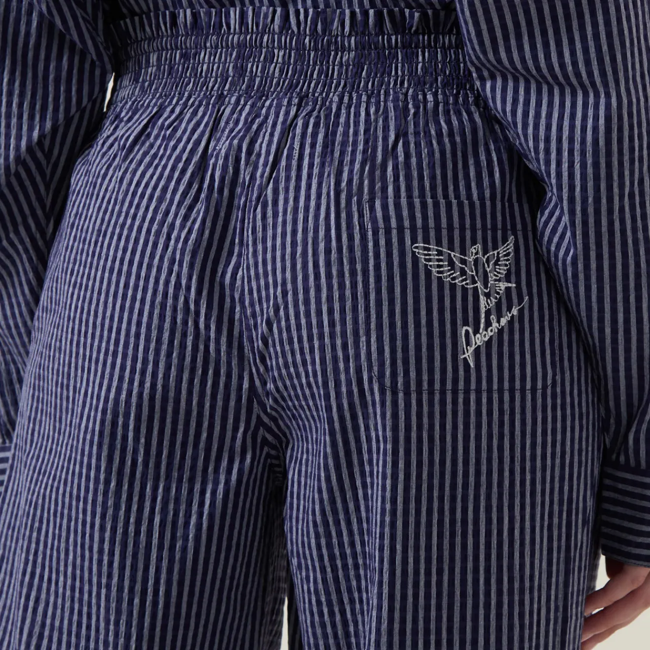 - Mid-rise, straight leg, elasticated waistband, mock button detailing, one rear patch pocket with embroidered logo detailing, clean hems, striped design, textured finish