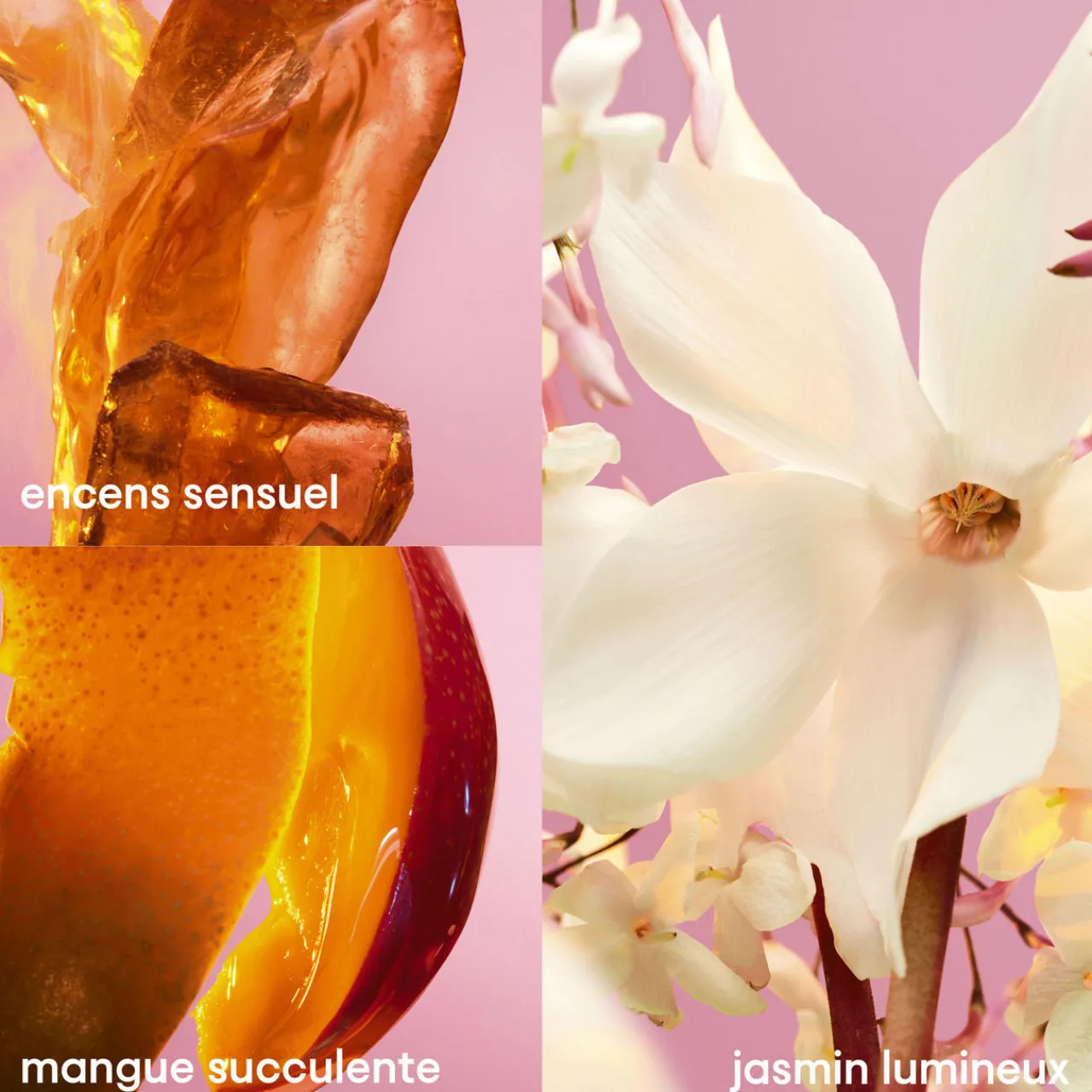 Composed of exceptionally pure jasmine, succulent mango and an addictively sensual creamy incense. The quintessence of avant-garde luxury bursting with precious ingredients. A truly irresistible scent radiating joy and audacious sensuality. Succulent mango. Delicate, airy exceptionally pure jasmine perfume. Addictive, sensual, creamy incense.