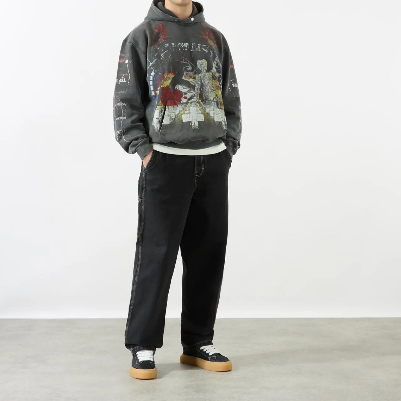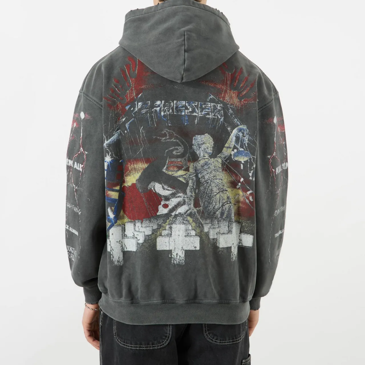 - Long sleeves, oversized fit, popper-fastened hood, Metallica graphic artwork, distressed detail, ribbed cuffs and hem