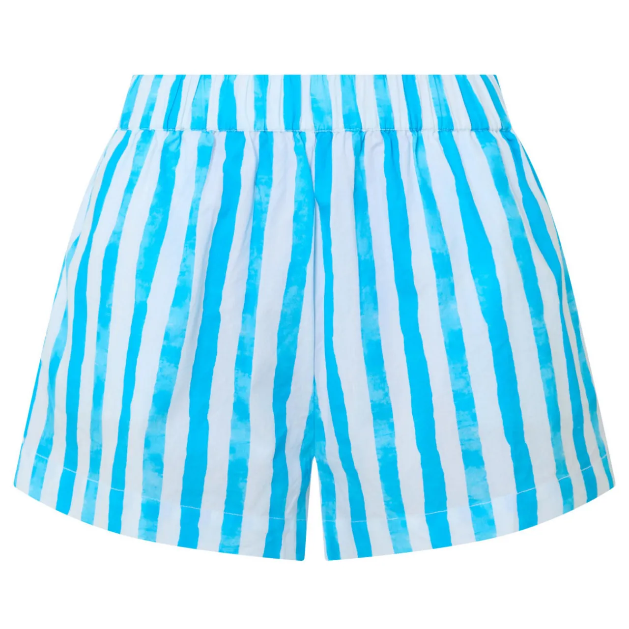 - Mid-rise, straight leg, elasticated waistband, two side slit pockets, straight hems, striped design, lightweight