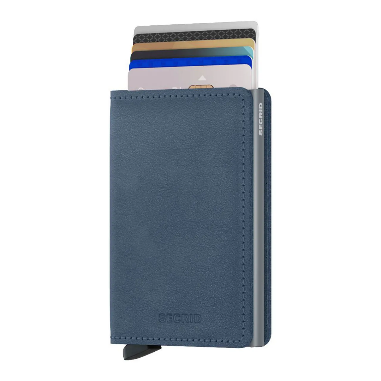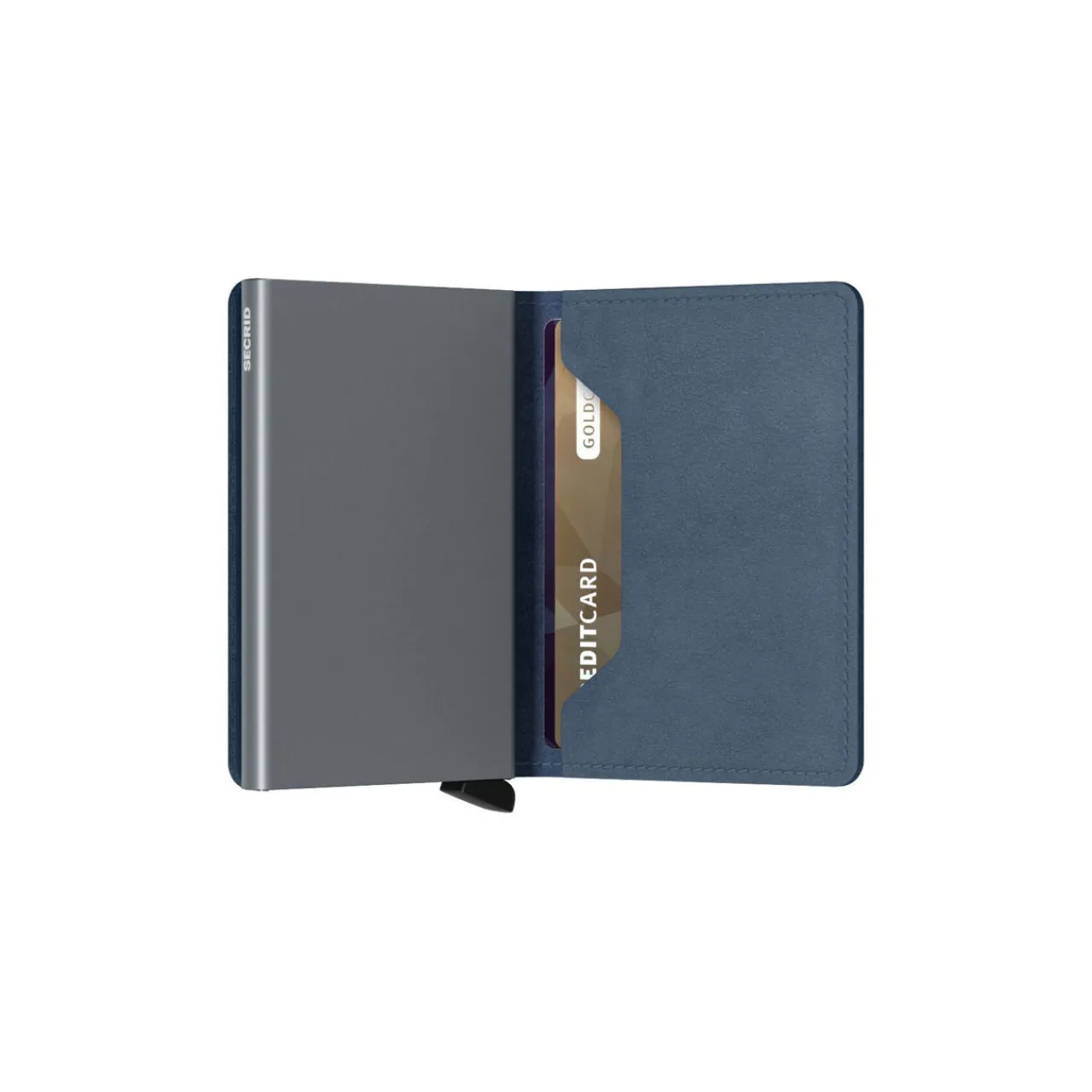 - Patented slide mechanism, brand logo details, magnetic clasp closure, contrasting aluminium case, smooth leather case, RFID/NFC security