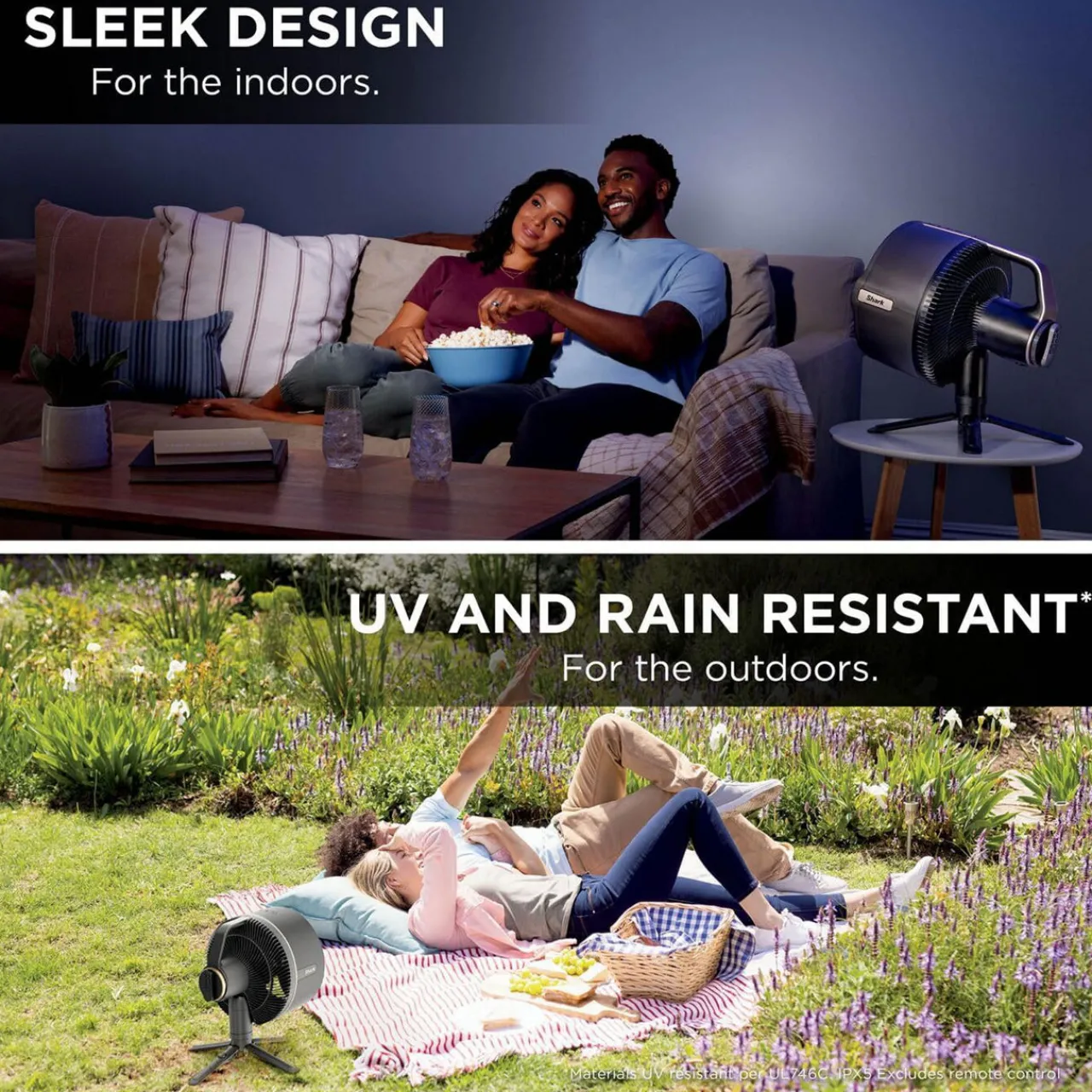 Outdoor Tough, Indoor Sleek Designed to withstand the elements, the Shark FlexBreeze Pro Mistfeatures UV*** resistance and a water-resistant design,making it perfect for outdoor use, rain or shine.