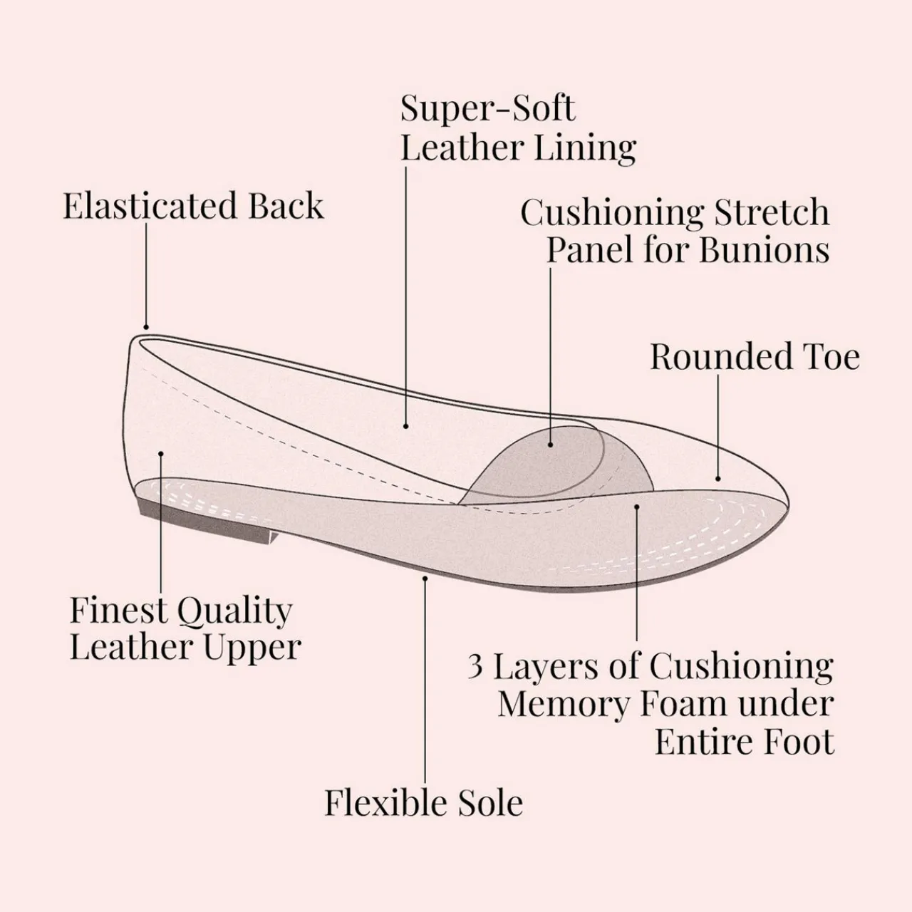 - Leather fabrication, weave design, metallic finish, designed for all-day wear, three distinct layers of memory foam cushioning to comfort the entire foot, innovative Bunion Bed stretch panel for bunions and wide feet, soft leather lining, elasticated back for ease of wear, Juanet Technology®, rubber shock-resistant heel piece, podiatrist approved, handcrafted, slip-on style, rounded toe