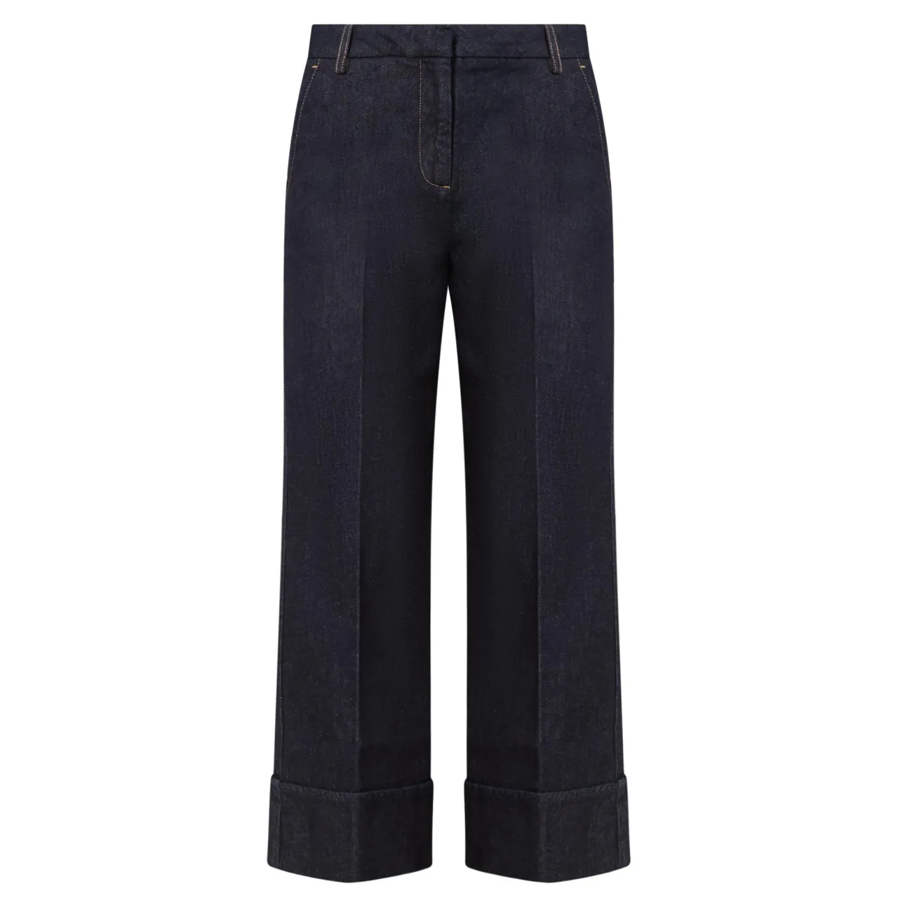 - Concealed zip-fly and button fastening, belt loops, two side in-seam pockets, contrast top stitching, mid-rise, flared-cut leg, pressed creases, smooth fabric