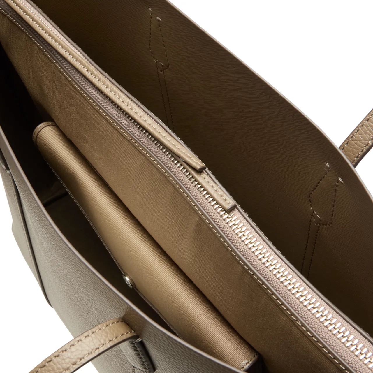- Interior: Two open compartments separated by a third with zip fastening, one flap pocket with snap button fastening