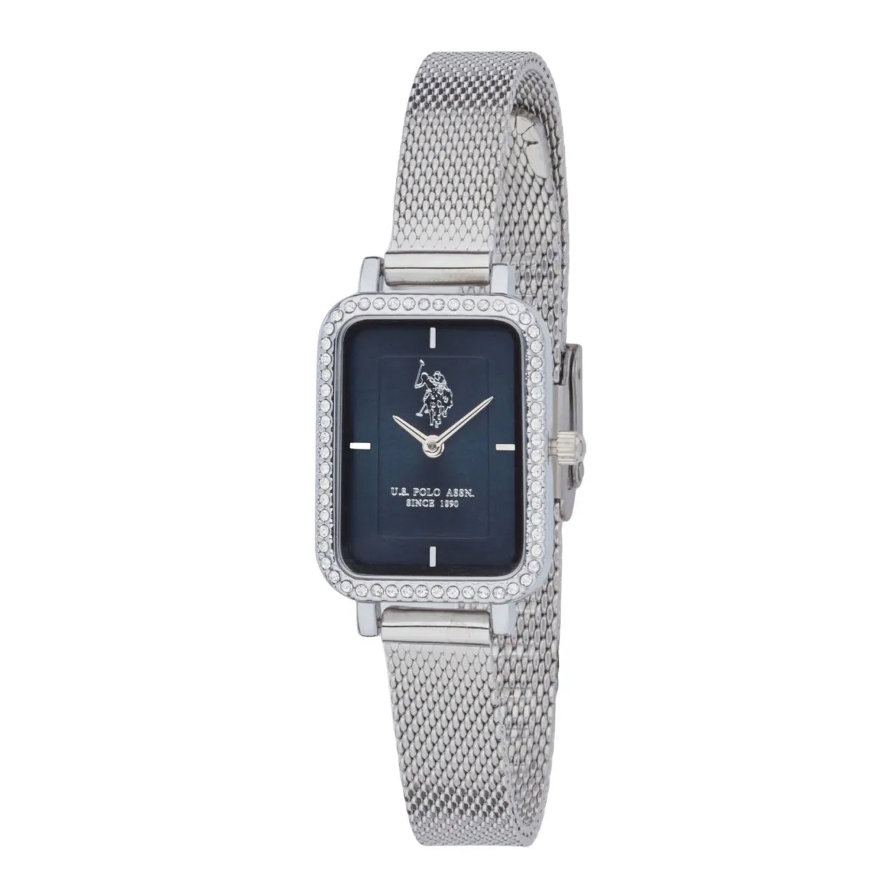 - Silver-tone slim rectangular case, silver-tone mesh bracelet, dark blue dial, silver-tone baton hour markers and hands, brand logo details, adjustable fit, bezel with crystal embellishment, quartz movement, two hands movement type