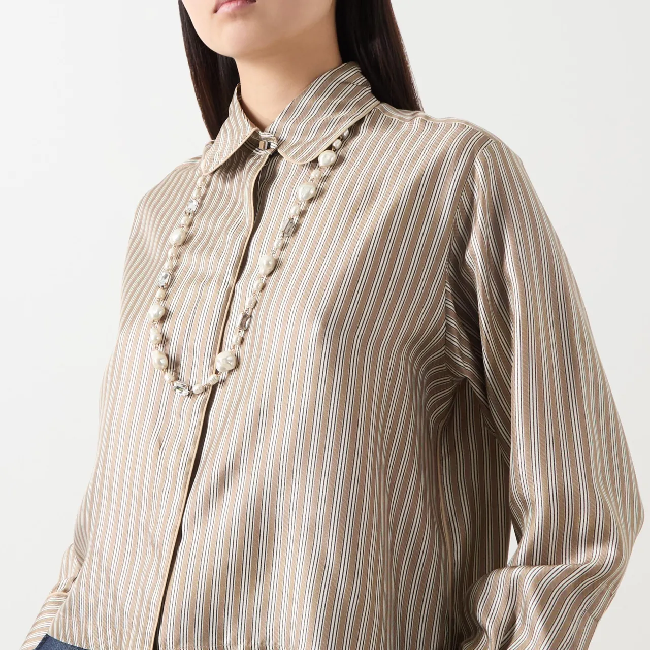 - Lobster clasp fastening, adjustable length, logo disc, glass beaded structure, faux pearl details, gold-tone hardware