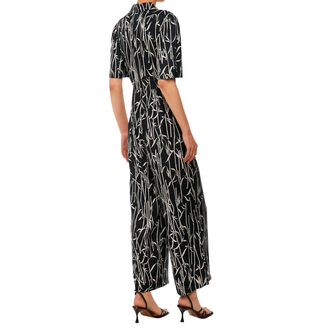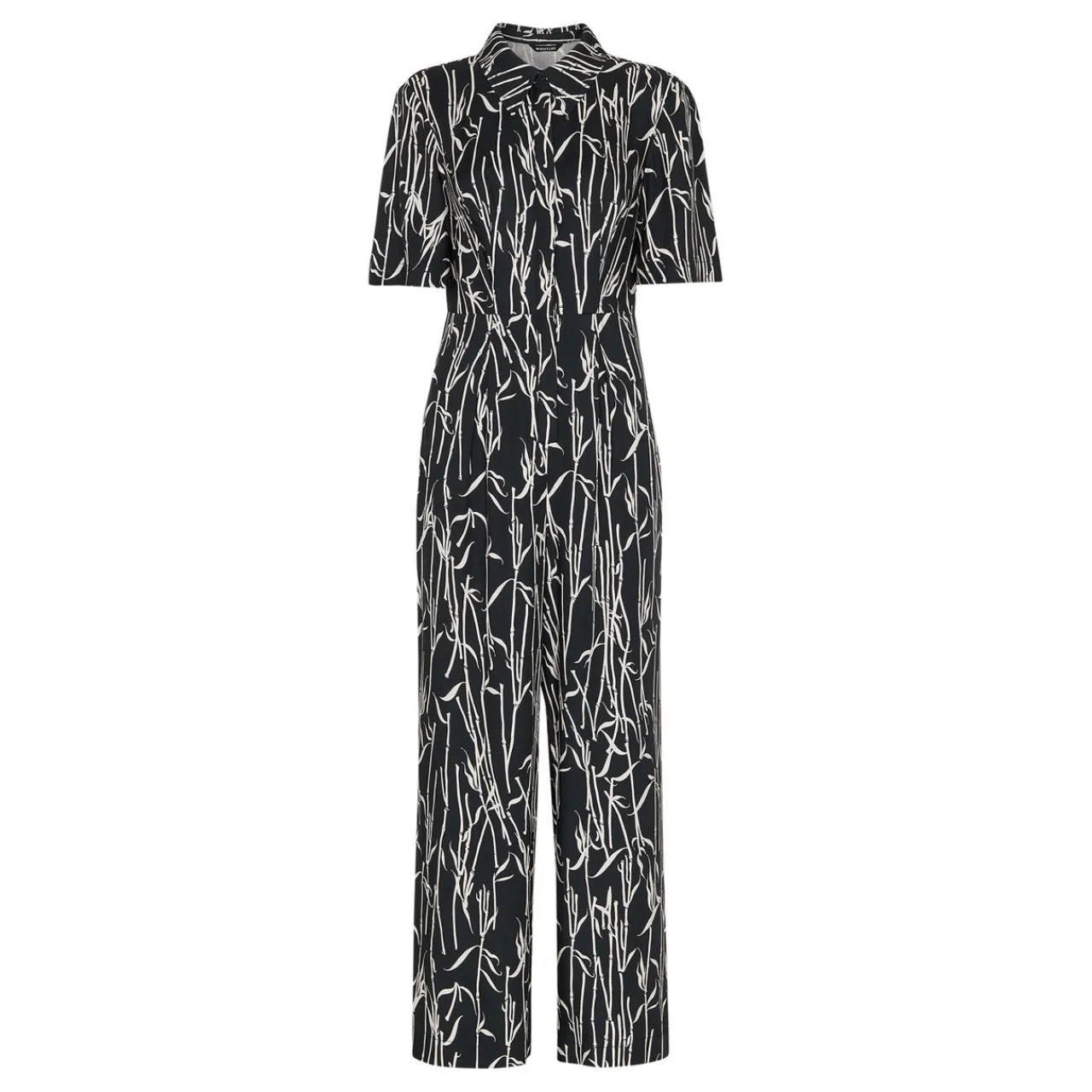 - Flat collar, half-button fastening, short sleeves, wide-cut legs, side entry pockets, bamboo shoots print