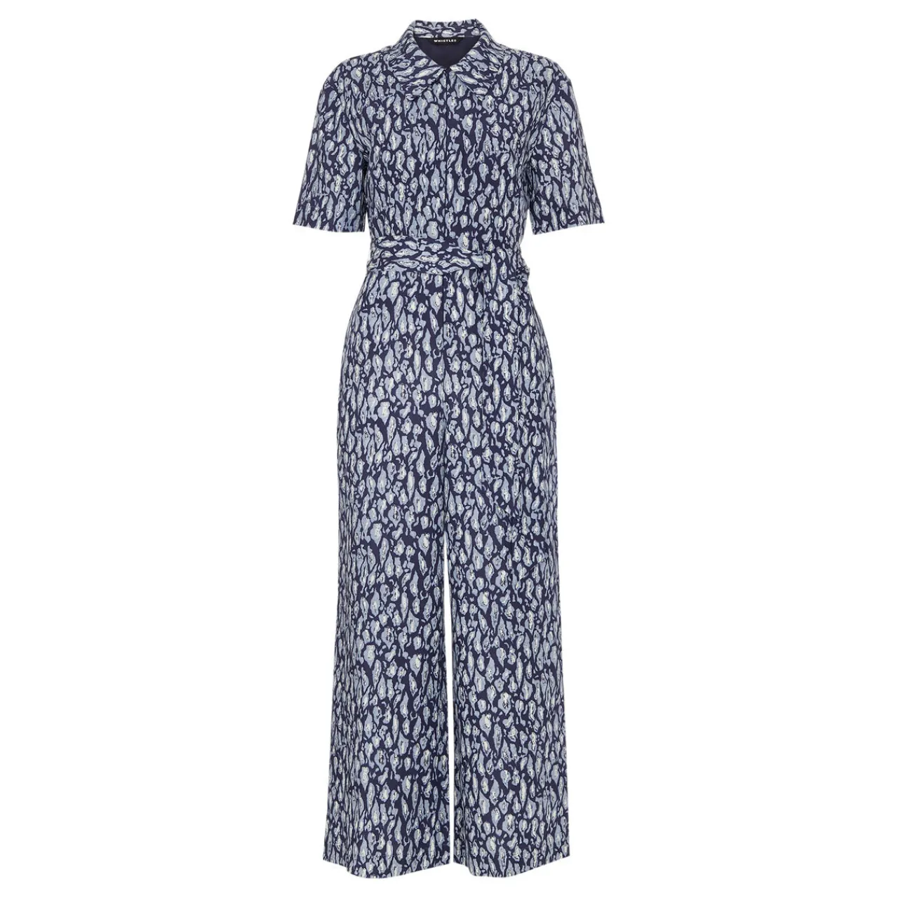 - Flat collar, half-zip fastening, cut-out at back, side entry pockets, self-tie belt at waist, belt loops, short sleeves, wide-cut legs, leopard print