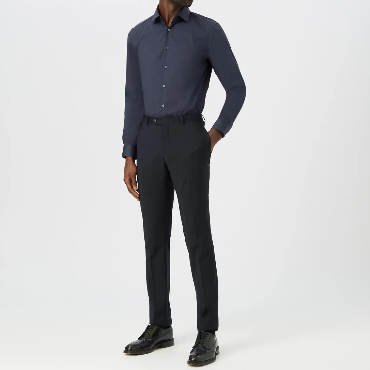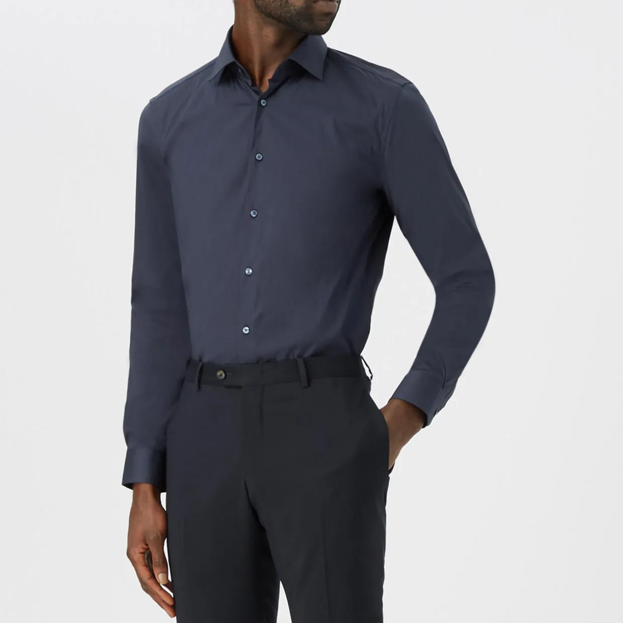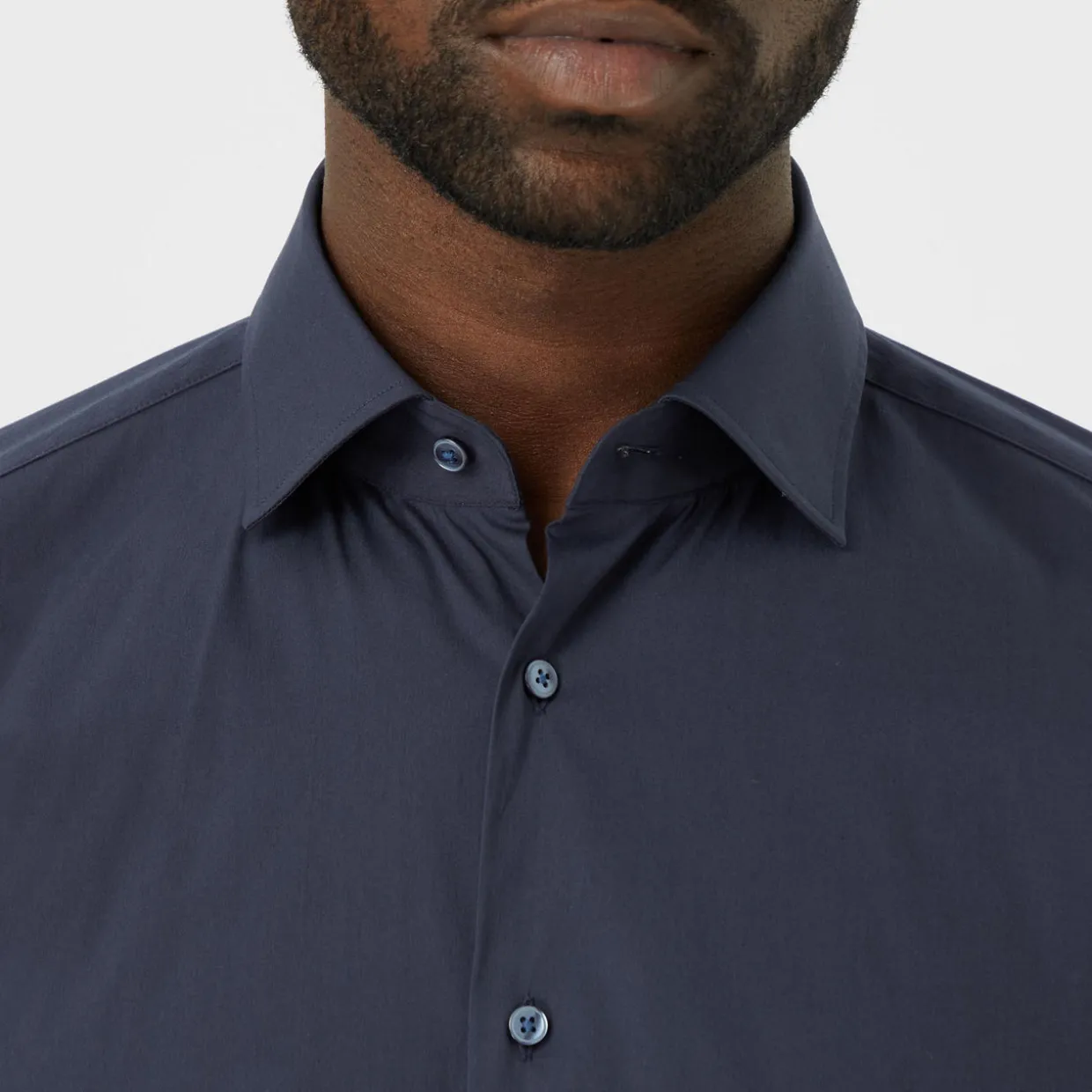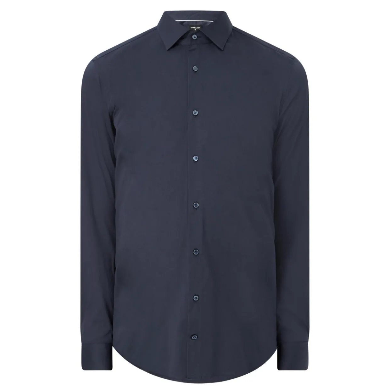 - Long sleeves, pointed collar, button fastenings, structured cuffs
