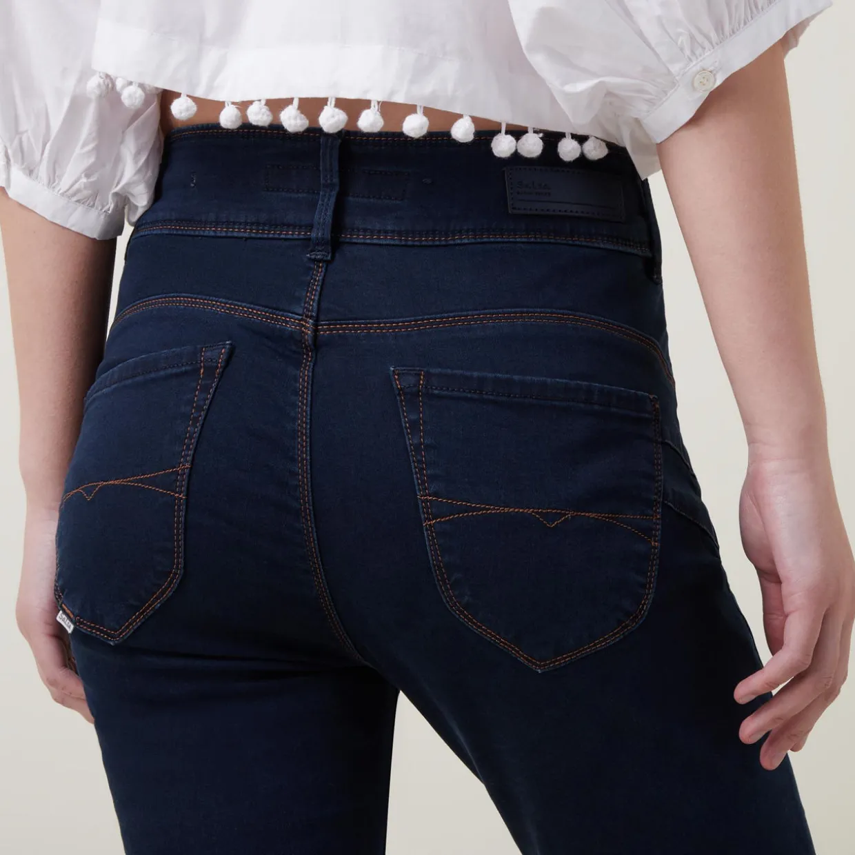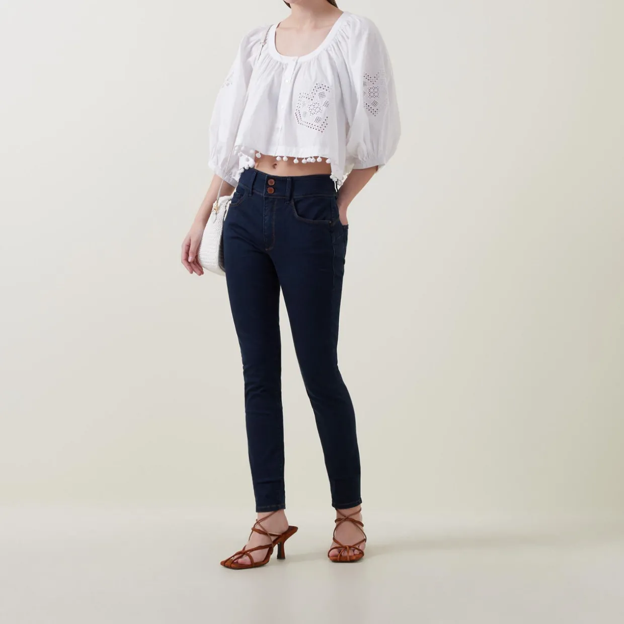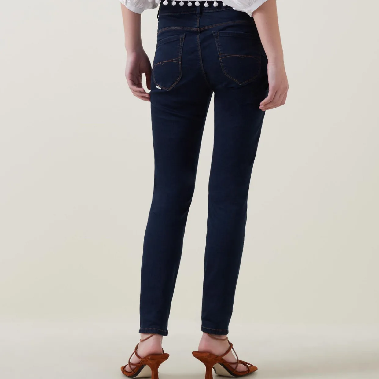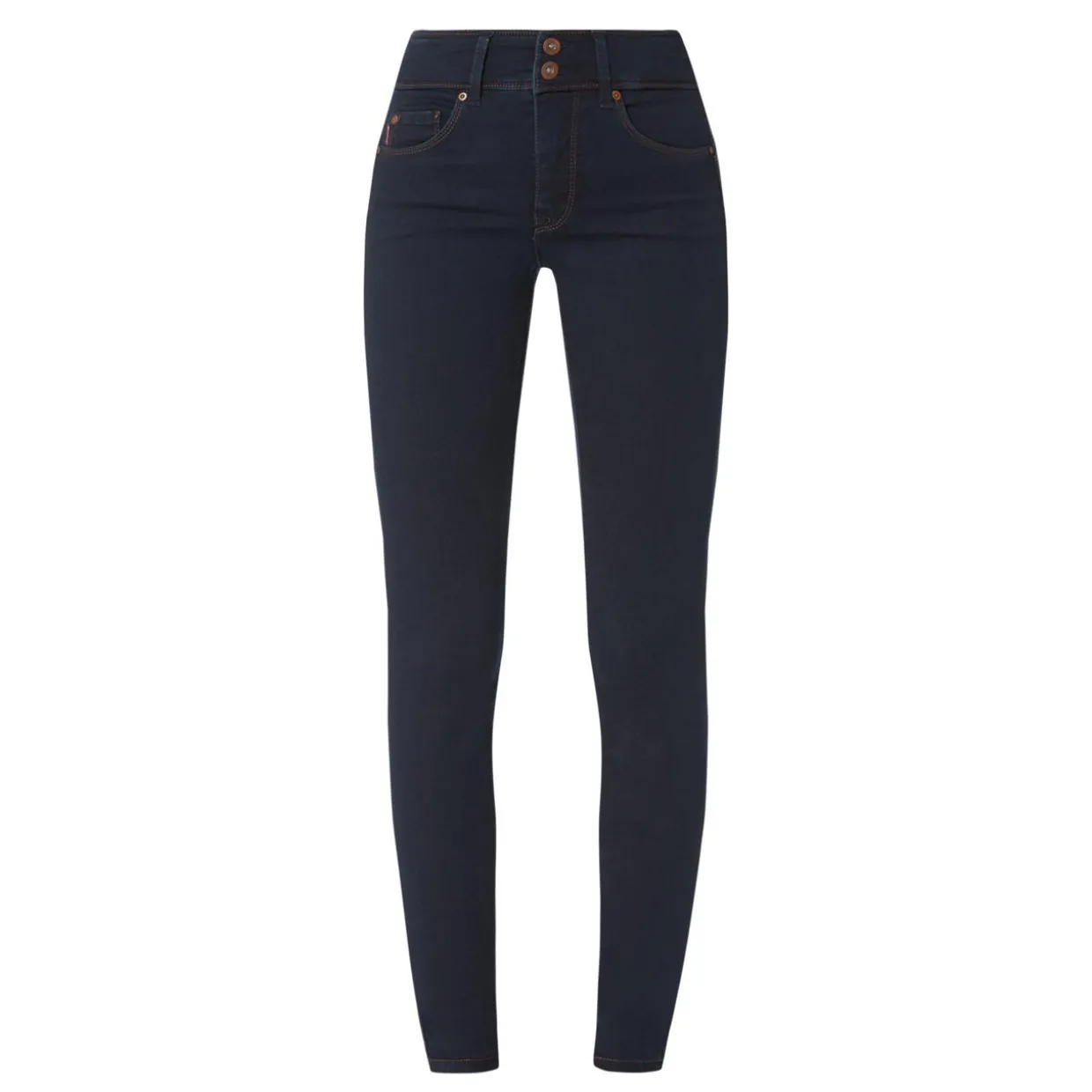 - Skinny fit, high-waist, leather tag, five pocket style, double button fastening with zip, push-up rear, tummy tuck effect.