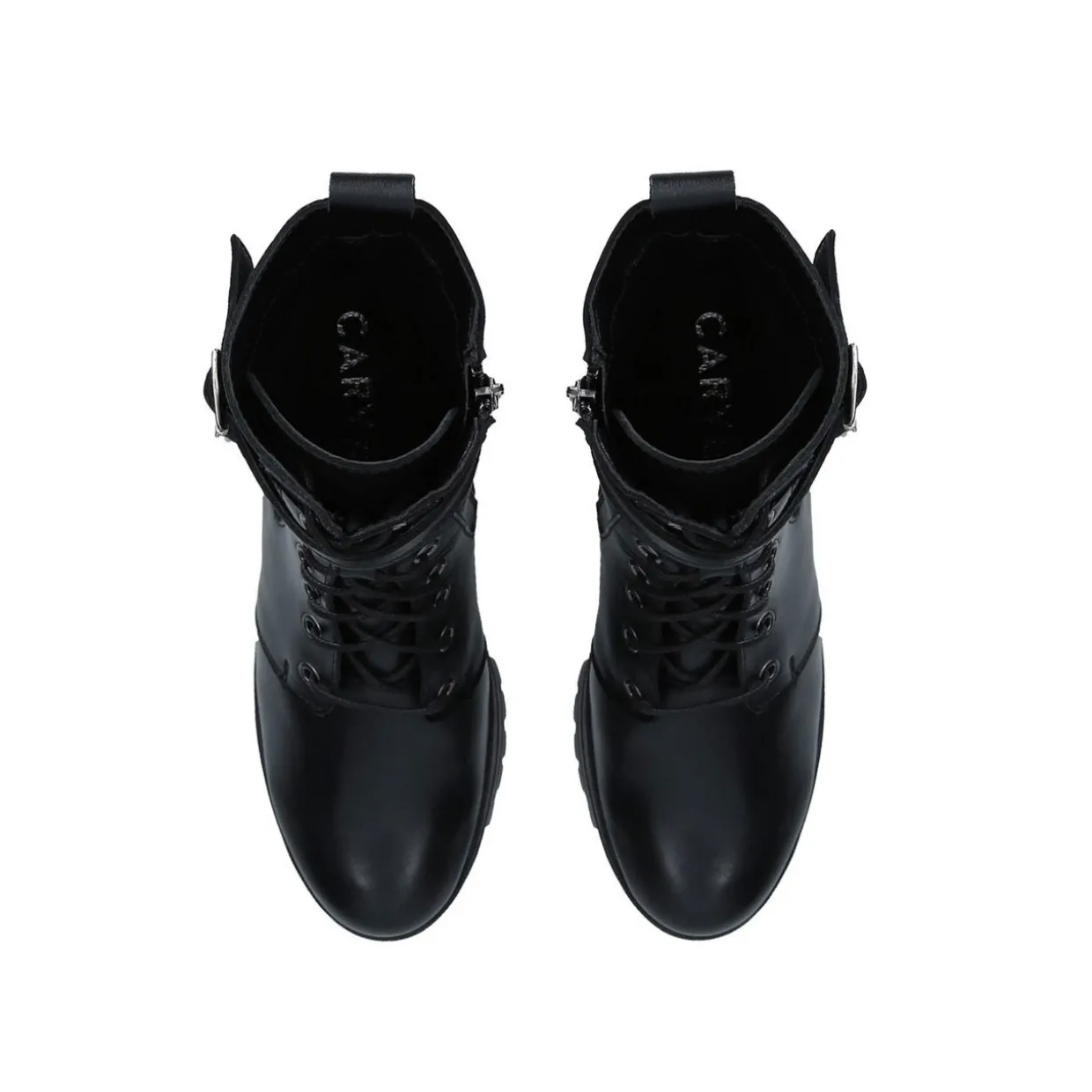 - Black leather upper, lace-up fastening, buckled ankle strap, lug style sole, silver-tone hardware, concealed side zip fastening, block heel