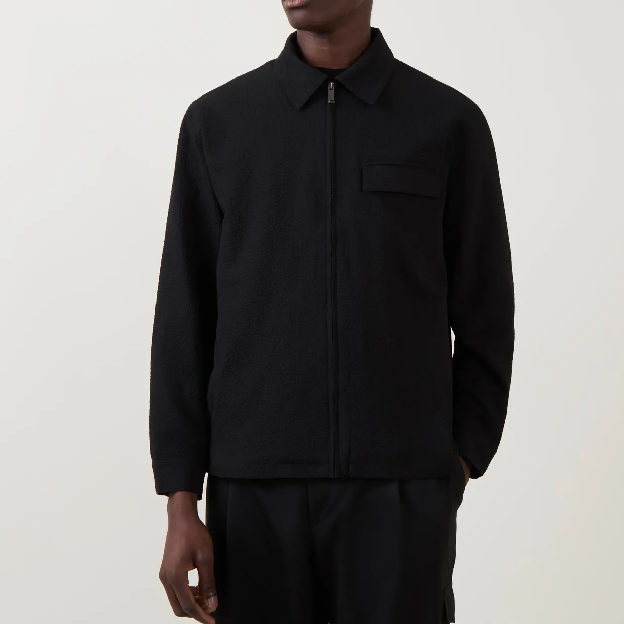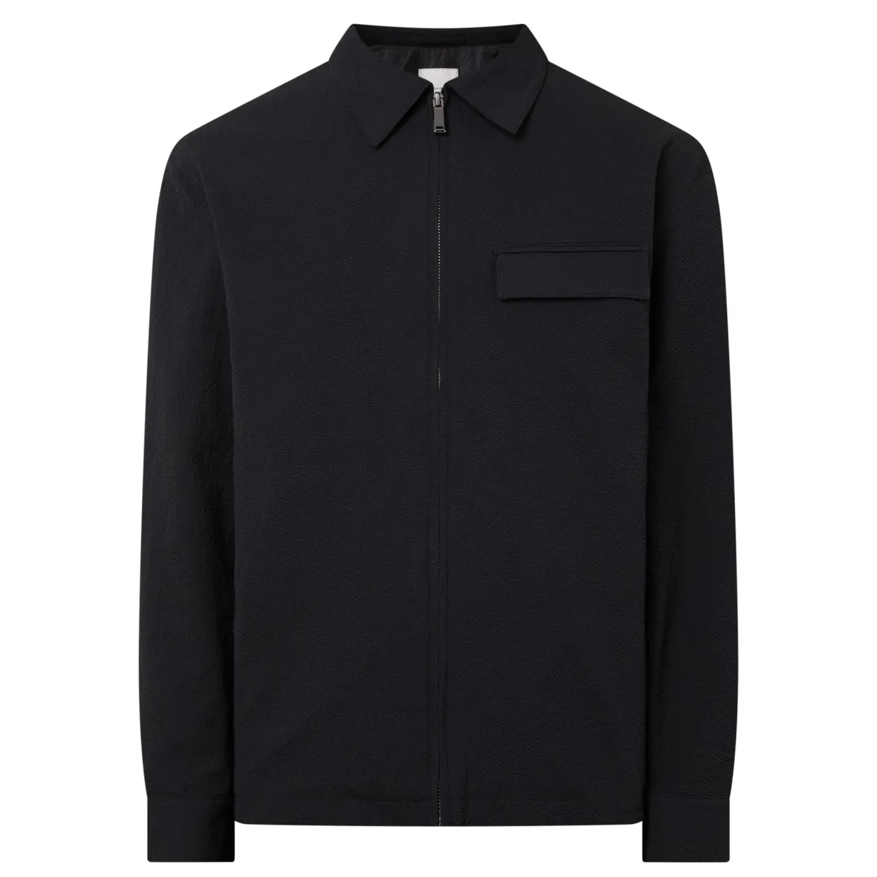 - Pointed collar, zip fastening, chest pocket, side entry pockets, straight hemline, logo details, seersucker fabric