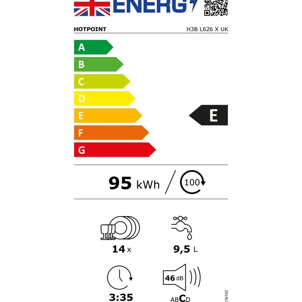 Hotpoint dishwashers quietly remove stubborn, baked-on food, so you can count on us to get your tableware spotless. The H3B L626 X UK features 5 programmes including Half Load so you can save on energy and water when you’ve only got a half load. When you need your dishes in a hurry, the rapid wash cycle will wash a small load of lightly soiled dishes in just 30 minutes and with exceptional reduced water consumption you can wash a full load with just 9.5 litres of water, caring for our planet and your pocket.