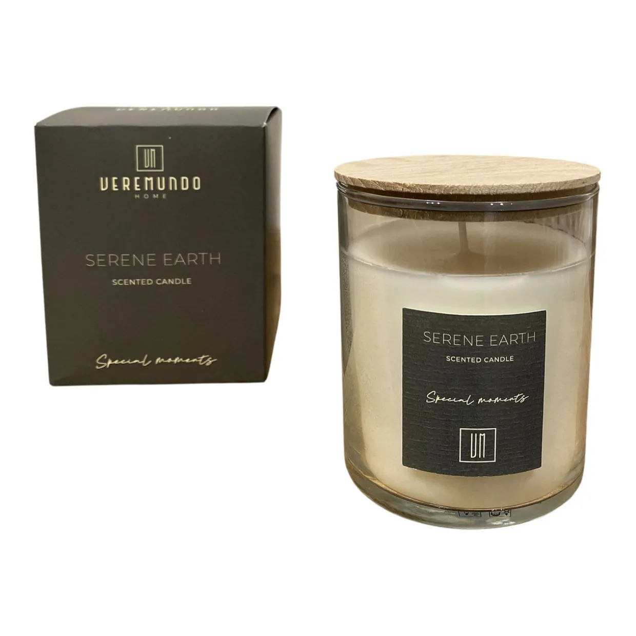- 100% vegetable wax candle in a clear glass container with a wooden lid, crafted with cotton wick and 91% vegetable wax + 9% perfume, offers a calm and grounding atmosphere with a natural, earthy fragrance