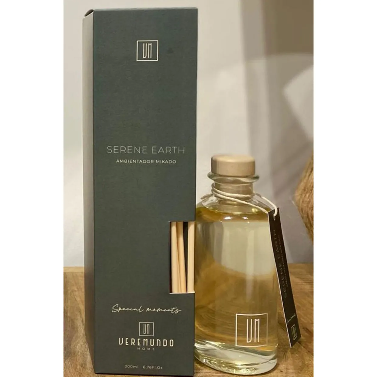 - Mikado air freshener with Serene Earth scent, featuring 6 natural-colored rattan rods, clear glass, and a synthetic beechwood-colored stopper for a calming fragrance experience