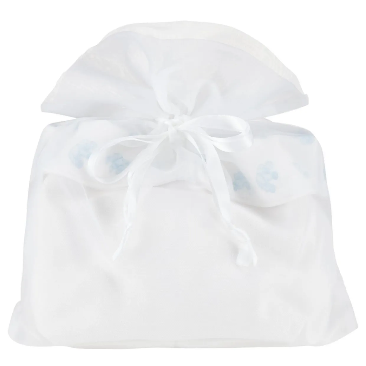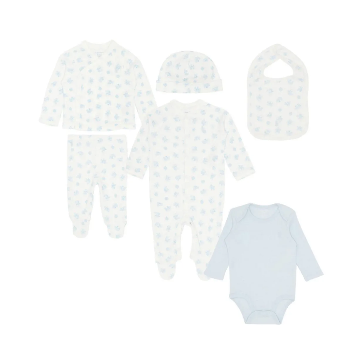- Seven-piece set, long-sleeves overalls, long-sleeves bodysuit, long-sleeved top, footed bottoms, beanie, fold-over trim bag.