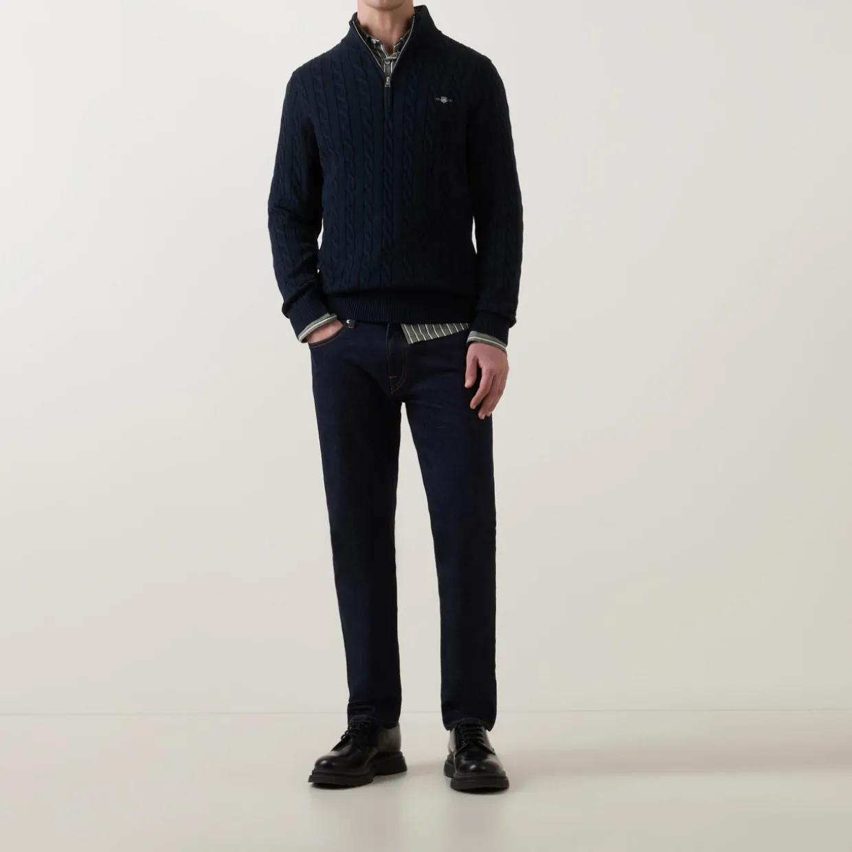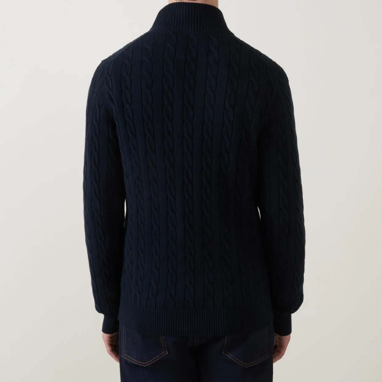 - Stand-up ribbed collar, half zip-fastening placket, long sleeves, dropped shoulders, logo shield embroidery, ribbed hemline and cuffs, cable-knit finish