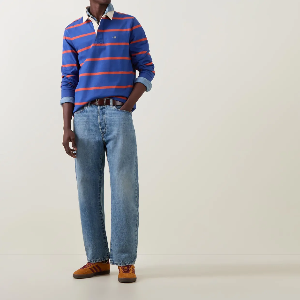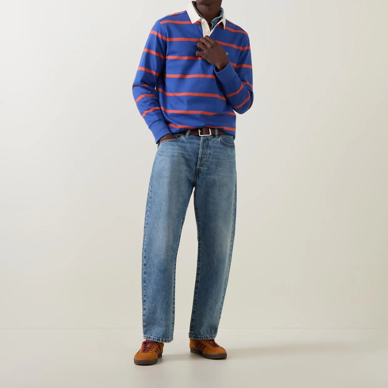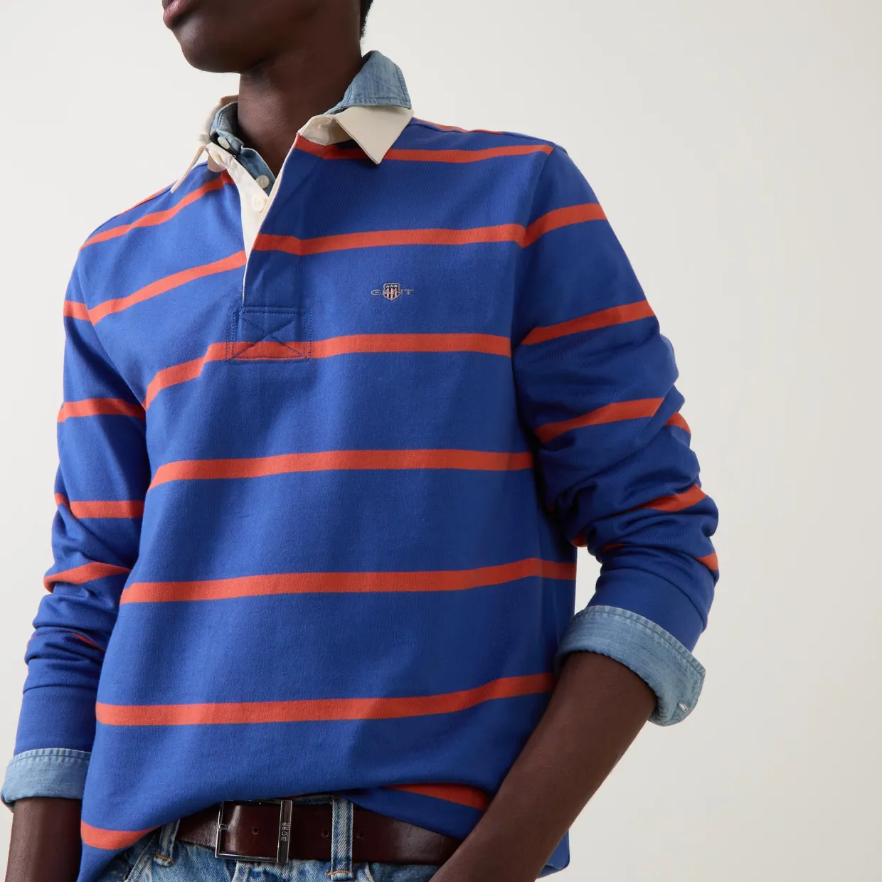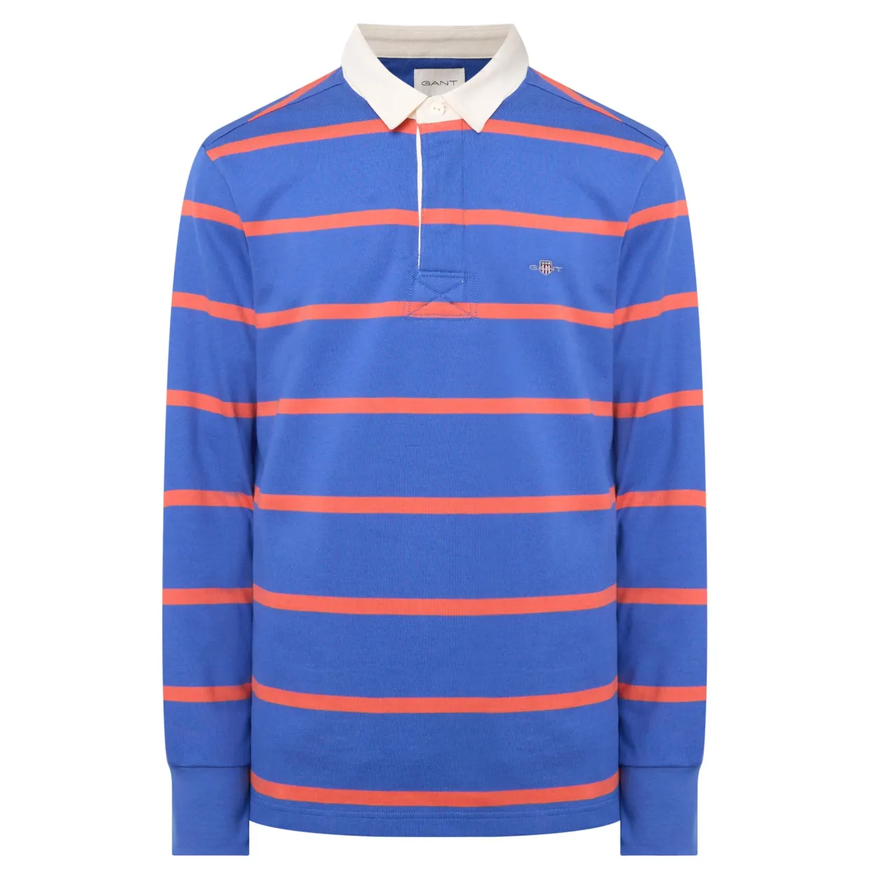 - Striped, contrast collar, concealed button placket, shield logo, ribbed cuffs, straight hemline, button fastenings