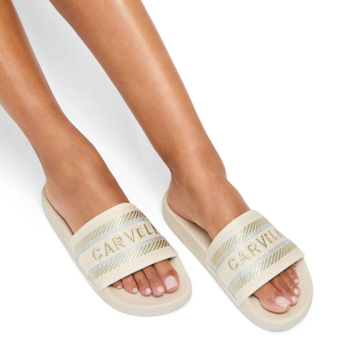 - Round open toe, fabric stitched upper, tonal logo detailing, crystal embellishments, slip on style