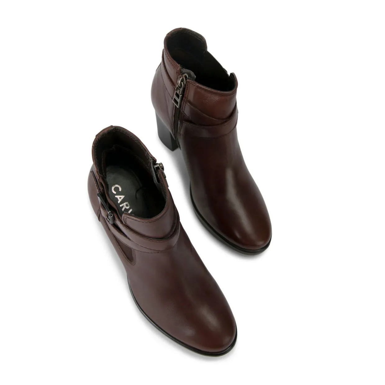 - Leather upper, gunmetal buckle, zip fastening, block heel, round toe, ‘All Day Long’ technology