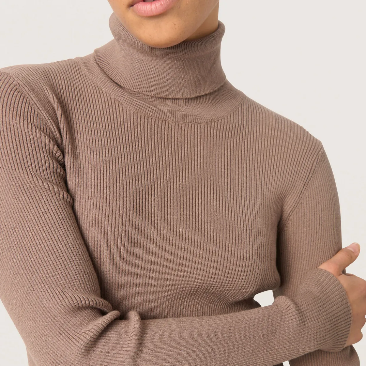 - Turtleneck, slightly dropped shoulders, long sleeves, straight hem, rib-knit design