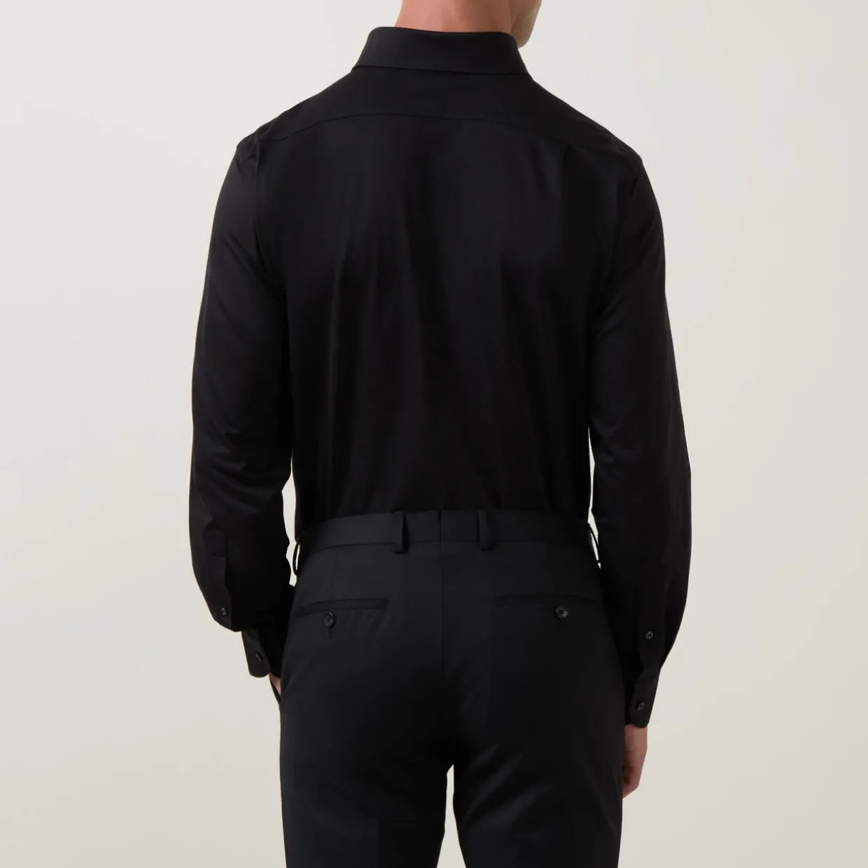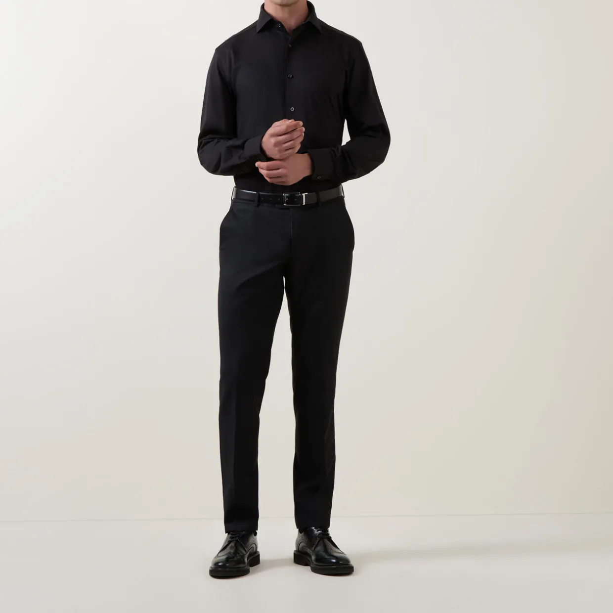 - Long sleeves, cutaway collar, button fastening, tonal stitching, single-button cuffs, curved hemline, smooth fabric